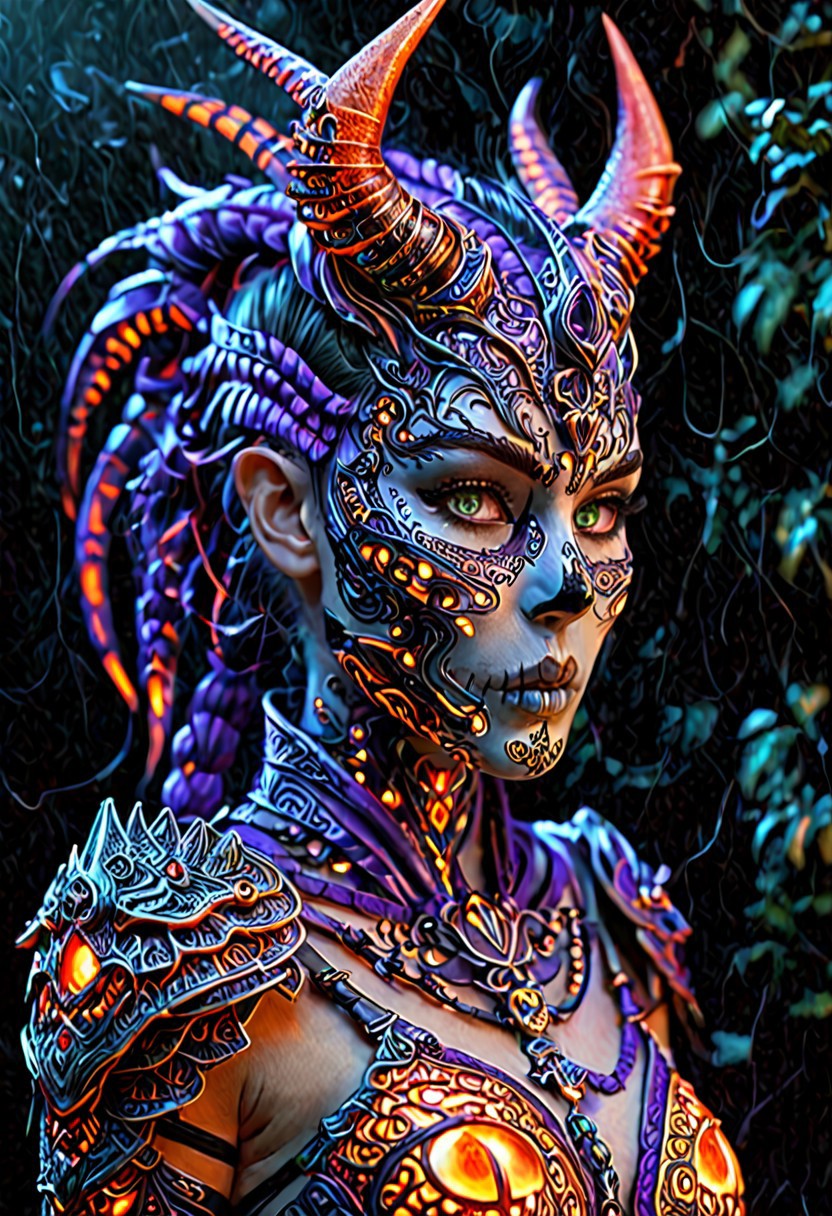 masterpiece:1.3, best quality:1.3, absurdres:1.3, sharp focus, ray tracing render, 4k, 8k, UHD, intricately detailed, ultra-detailed, Rembrandt lighting:1.3, lense flare, dynamic lighting, canon 50mm 1.8 aperture, wide shot, bioluminescent:.7, glowing:.7, feminine demon, green glowing armor accents:1.3, skull and bones armor, detailed skulls, detailed horns, Face focus, 1 female, glowing fluorescent orange princess braid:.7, red wings, intricately detailed skull faced mask, purple areolas, standing firm, holding sword,:.7 dynamic pose, crimson and violet color palette, BREAK, night time, darkness, intricately detailed ninja clan headquarters