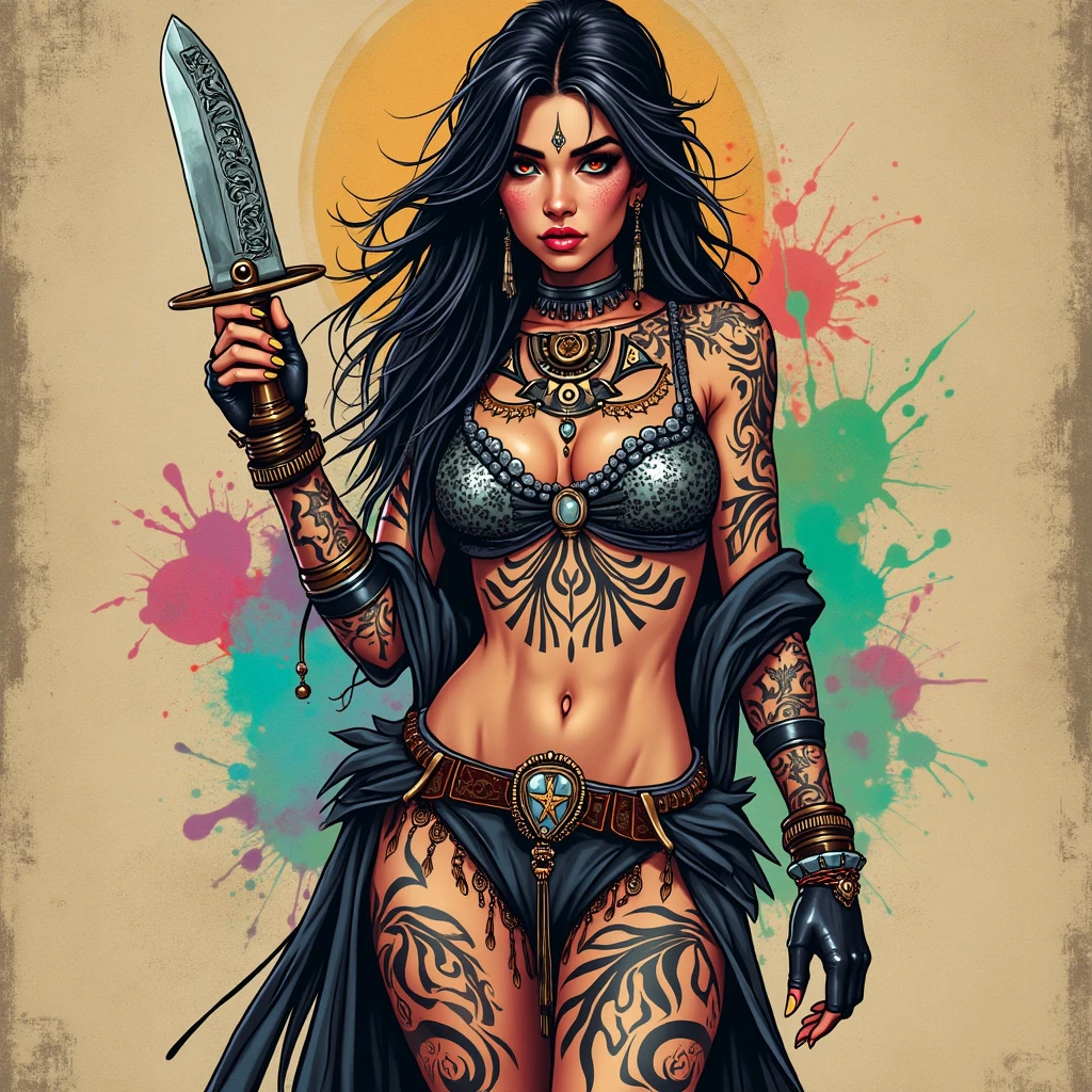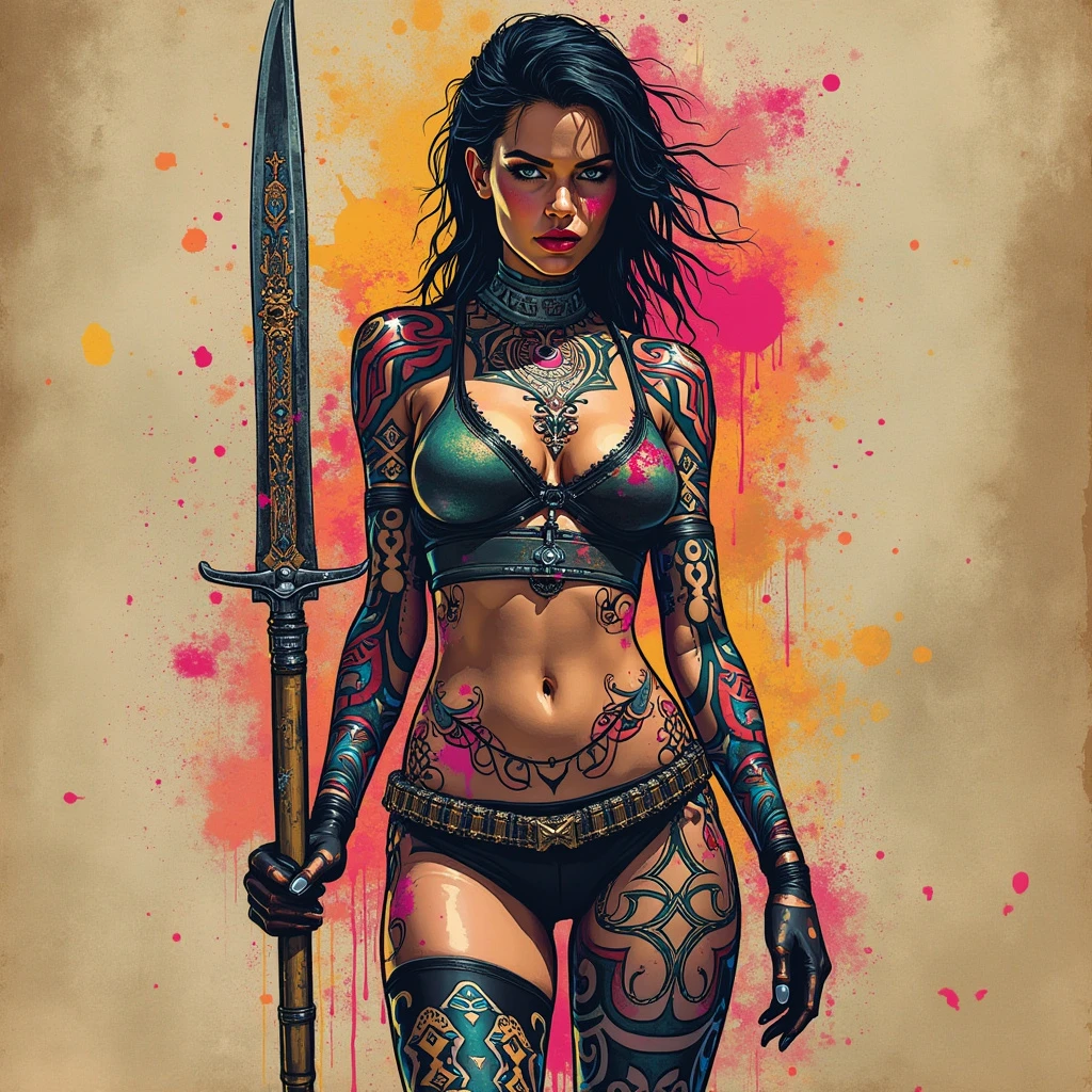 A tribal drawing of a lady standing holding an engraved knife, styled with a mix of decopunk and graffitipunk elements. The lady's body features intricate tribal patterns, while her outfit has metallic and geometric designs. The background is a grungy, vintage texture with vibrant, colorful graffiti splashes. Created using ink and digital overlays, tribal patterns, geometric shapes, bold graffiti strokes, distressed textures, metallic highlights, vibrant colors, hd quality, vivid style.