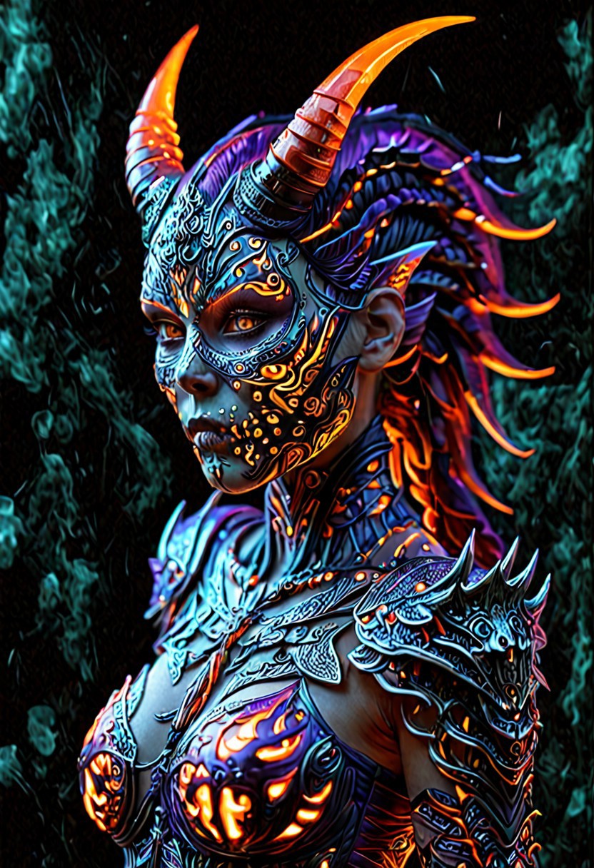 masterpiece:1.3, best quality:1.3, absurdres:1.3, sharp focus, ray tracing render, 4k, 8k, UHD, intricately detailed, ultra-detailed, Rembrandt lighting:1.3, lense flare, dynamic lighting, canon 50mm 1.8 aperture, wide shot, bioluminescent:.7, glowing:.7, feminine demon, green glowing armor accents:1.3, skull and bones armor, detailed skulls, detailed horns, Face focus, 1 female, glowing fluorescent orange princess braid:.7, red wings, intricately detailed skull faced mask, purple areolas, standing firm, holding sword,:.7 dynamic pose, crimson and violet color palette, BREAK, night time, darkness, intricately detailed ninja clan headquarters