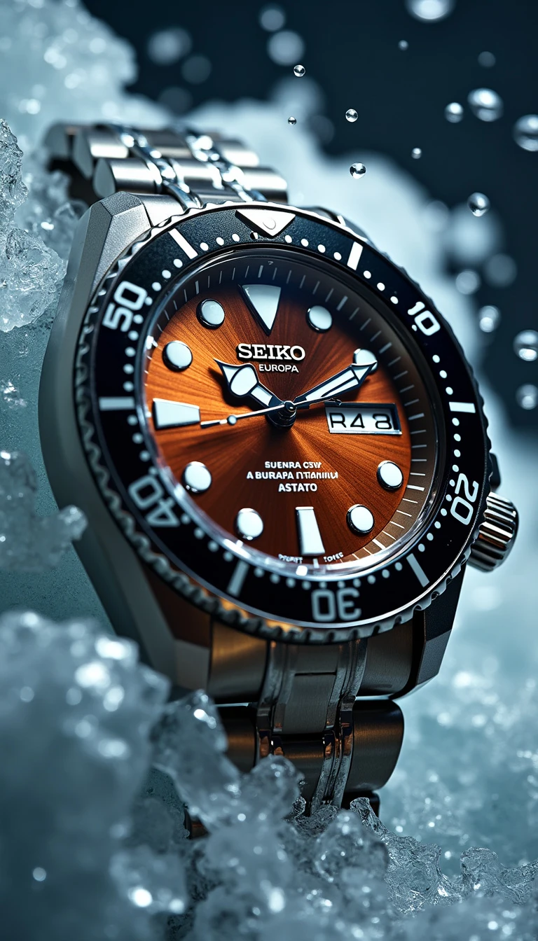 commercial advertising product photography in the style of SEIKO for NASA EUROPA dive expedition, extreme macro shot of a SEIKO diving watch, radiant metallic copper sunburst watchface in finely expanding concentric circles, Printed on the lower half of the watchface is the watch model name "EUROPA TITANIUM" and in a smaller text below it "ASTRO 500 ATM", shiny chrome chapter ring, raised white lume indices with chromed outline, thick matte-finish titanium rotating bezel with large scalloped contour edges, chromed steel bezel insert wtih engraved number markings in gloss black paint, thick and industrial titanium case in an angular brutalist shape, titanium bracelet in interlocking tank track style design, helical cut knurled crown and brutish crown guard at 4 o'clock position, diffuse backligthing, the watch is dropping into water and partially submerged in water, floating chunks of ice shards in the water, water splash, round water drops on watch surface, focus on SEIKO logo, full depth of field, focus stacked.