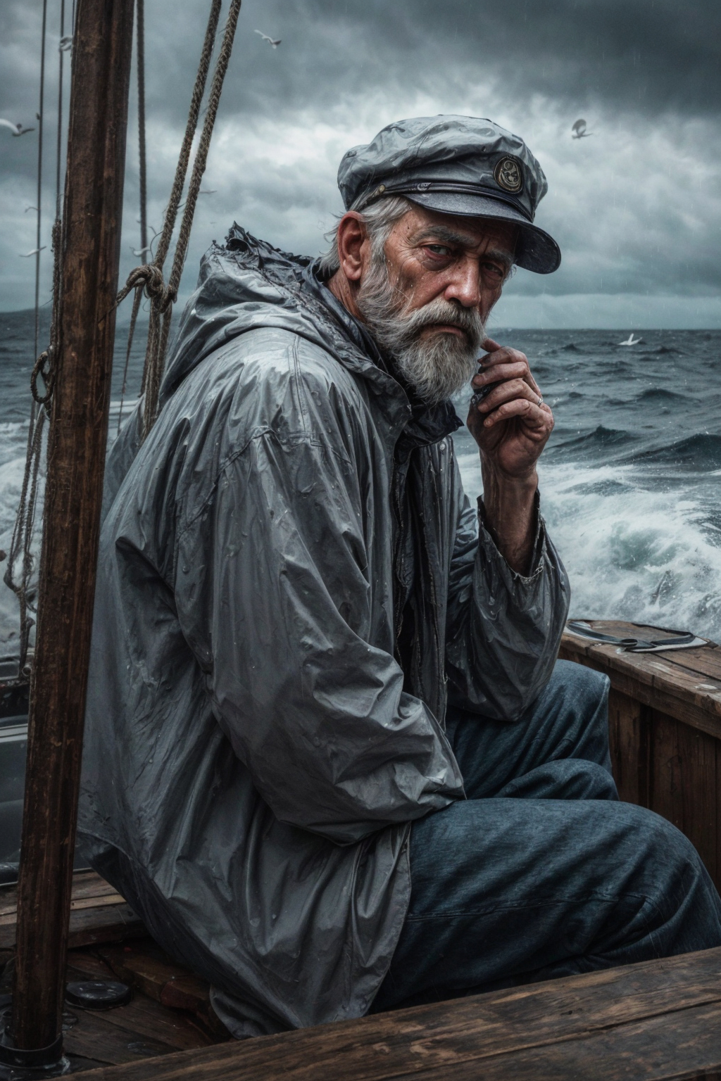 (RAW photo, 8k uhd, Analog style, Masterpiece, Best Quality, Highres:1.4), (dramatic, cinematic:1.2), BREAK, movie shot of (80 yo:1.2) (old male:1.3) (fisherman:1.25) (sailor man:1.25) (sitting:1.1) (on deck:1.35) of (old dilapidated:1.2) (wooden sailboat:1.3), against railing, (from side:1.2), (stern face:1.2), (deep wrinkles:1.2), (gray long beard:1.3), (grey eyes:1.2), ((shabby:1.2) old (torn:1.15) (raincoat:1.1), brown (pants:1.1), (sailor hat:1.1) (sou'wester:1.2), jackboots:1.1), (lowered head:1.2), (tired sad expression:1.15), BREAK, (stormy sea, gloomy dark clouds:1.2) on background, (splashes, water drops, rain:1.25), (seafoam:1.1), (flying white seagulls:1.25), (rocks, cliffs:1.3), (dark haze:1.2), (wet clothes:1.1), fishing (nets with fish:1.3) on deck, (ropes:1.1), (tense hopeless eerie atmosphere, cold, floes:1.2), BREAK, (photorealistic:1.3), (rough details, (male focus:1.1):1.2), (desaturated, cold lighting:1.3), (hyperdetailed, absurdres:1.2), BREAK, <lora:more_details:0.9>, <lora:zoom_slider_v1:4.5>,