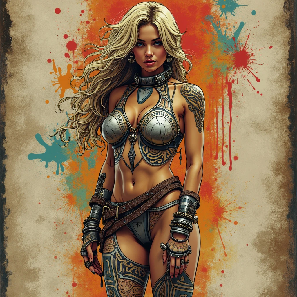 A tribal drawing of a lady standing holding another lady in her arms, styled with a mix of decopunk and graffitipunk elements. The lady's body features intricate tribal patterns, while her outfit has metallic and geometric designs. The background is a grungy, vintage texture with vibrant, colorful graffiti splashes. Created using ink and digital overlays, tribal patterns, geometric shapes, bold graffiti strokes, distressed textures, metallic highlights, vibrant colors, hd quality, vivid style. she has long wavy blond hair and blue eyes