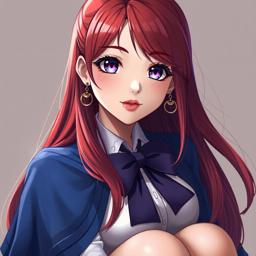 1girl, mature female, (thighs UP portrait) purple eyes, long hair, red hair, earrings, blue cloak, teacher, blouse, bowtie, curvy, large breasts, thighs, thick lips, shiny lips, leaning towards viewer, beautiful, detailed image, high quality detailed, UHD detailed matte, beautiful art UHD, school, painterly, faux traditional media.