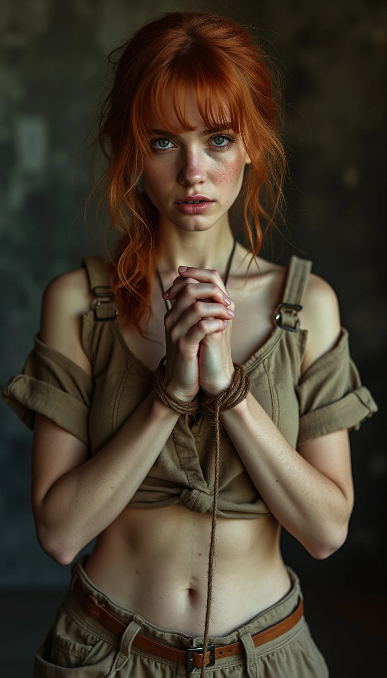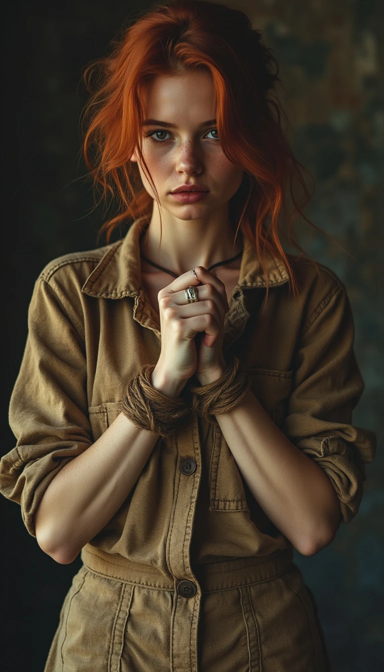 Film Noir portrait of a female prisoner, young woman, hands bound together in front of her with twine. Dressed in burlap clothing, earth tones, body pose, dynamic. She has red hair. By Apollonia Saintclair.