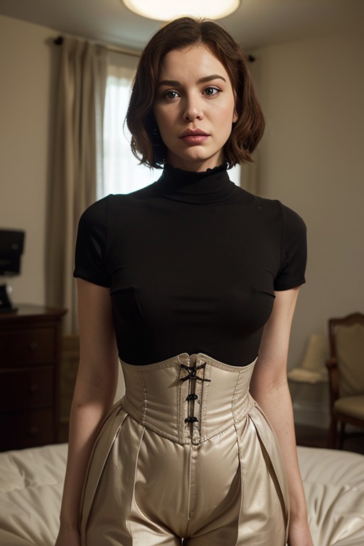 Christina Hendricks, charturnerv2, pushup corset, wide hips, small waist, huge tits, beautiful face, seductive, sexual,, 35mm film, perfect face, makeup, blue eyes, epiCPhoto