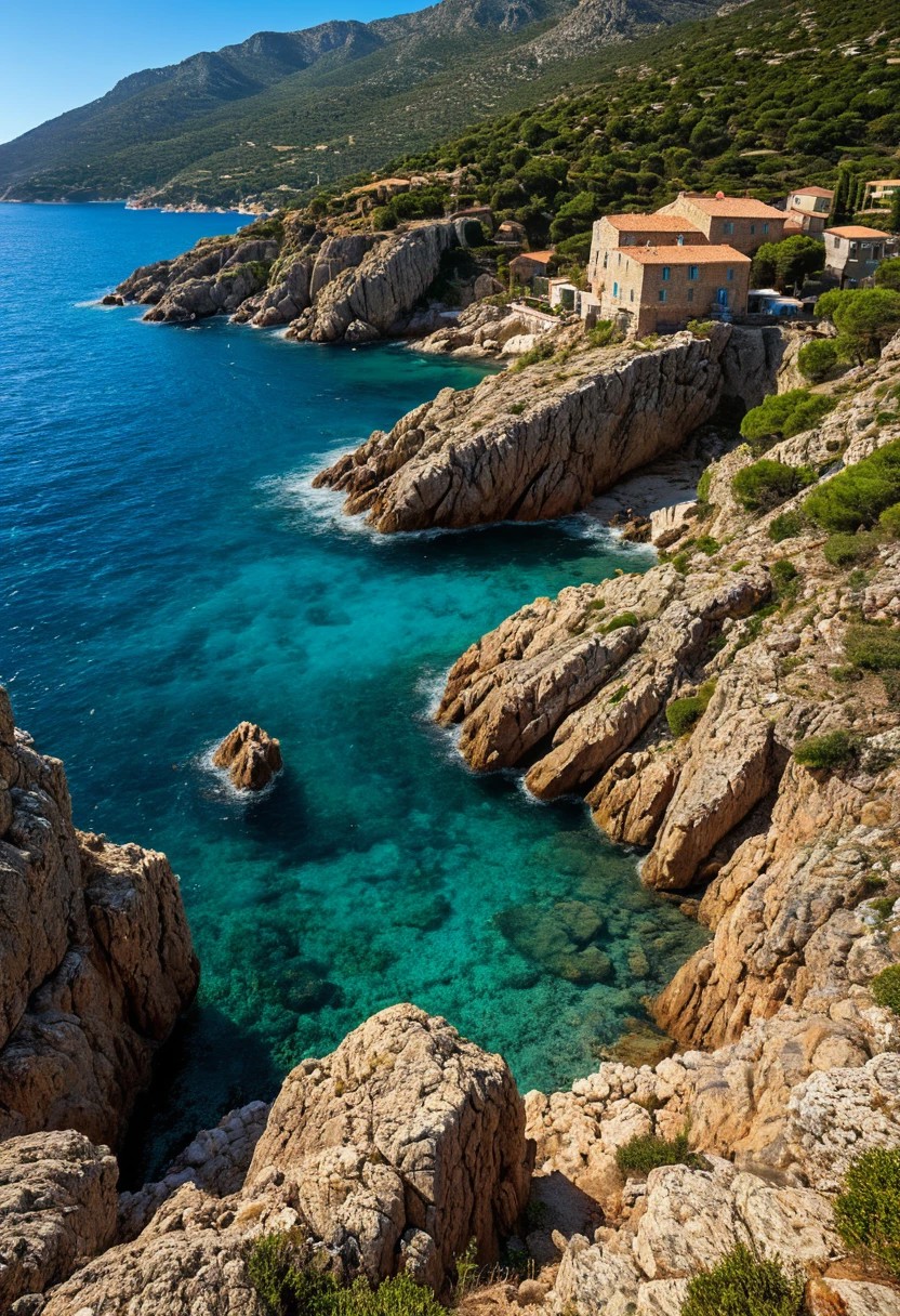 Realistic, photo of a stunning view of a Mediterranean coastline with crystal-clear waters in Corsica, rugged cliffs, and quaint seaside villages. Corsica, coastal details, luminous water reflections.