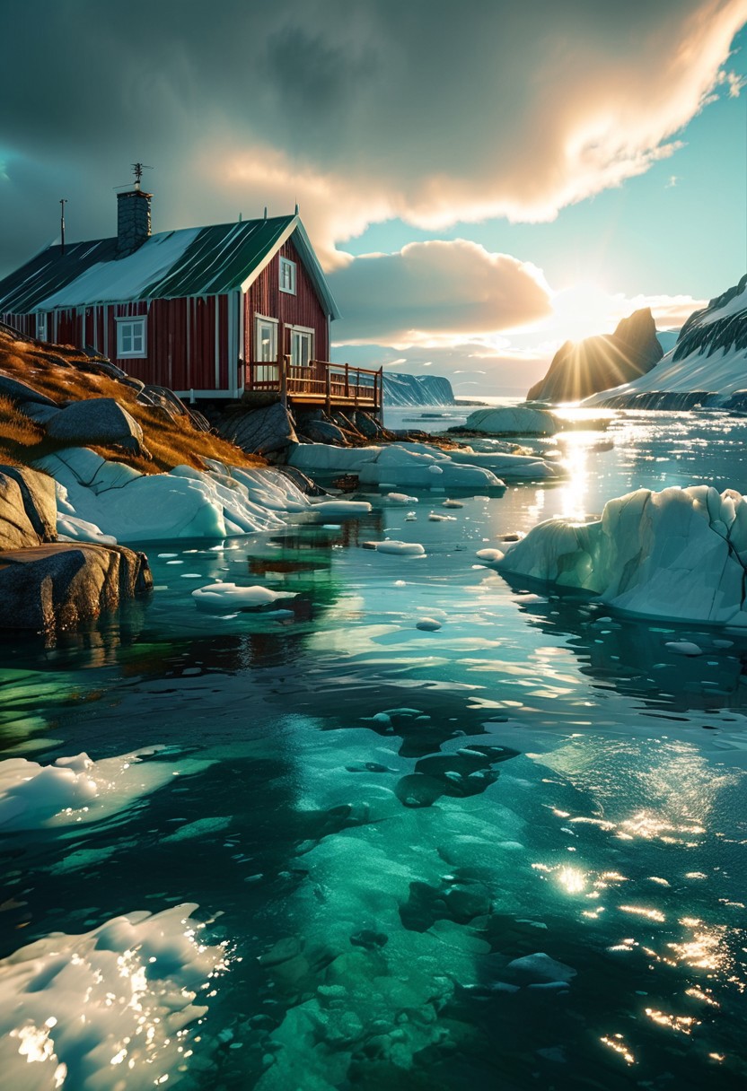(ultra high res:1.4), (masterpiece), (beautiful lighting:1.4) , greenland greenery, greenland river, icy water water, forest, Greenlandic homes and cabins, sunlight illuminates the icy water, (deep underwater), anime, above water, (clear underwater), beautiful sky with clouds, depth
