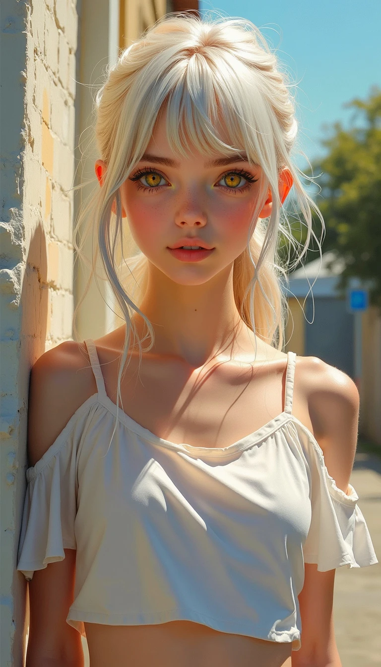 Oil Painting. Xanthe has white-blonde hair with a prismatic shine. Prism effect on her hair. Opalescent. Her hair is pulled back behind her ears. Her eyes are yellow. She wears 2000s style clothing for teenagers. She is eighteen-years-old. She is standing in sunlight.