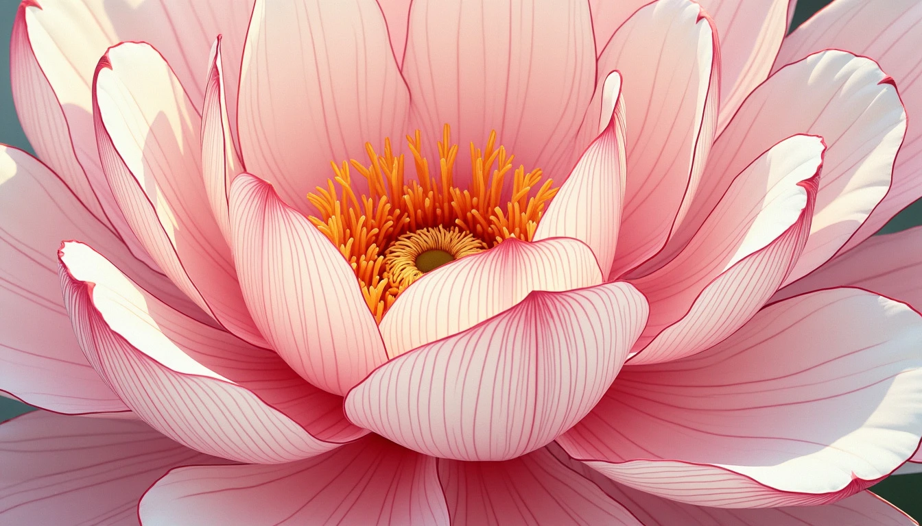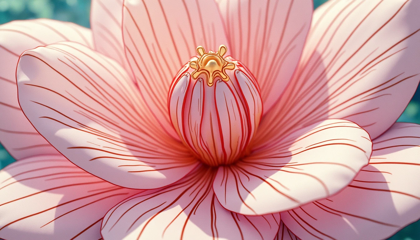 90's Japanese anime, Hayao Miyazaki, Hiroshi Nagai, Hergé and Studio Ghibli. A close-up of the petal texture, showcasing delicate pink lines and subtle shadows on white petals, creating an enchanting visual experience. Elegant shapes, well drawn, symmetrical design, balance design, consistent style, evenly laid design elements, perfect aspect ratio, perfect composition, impeccable attention to details