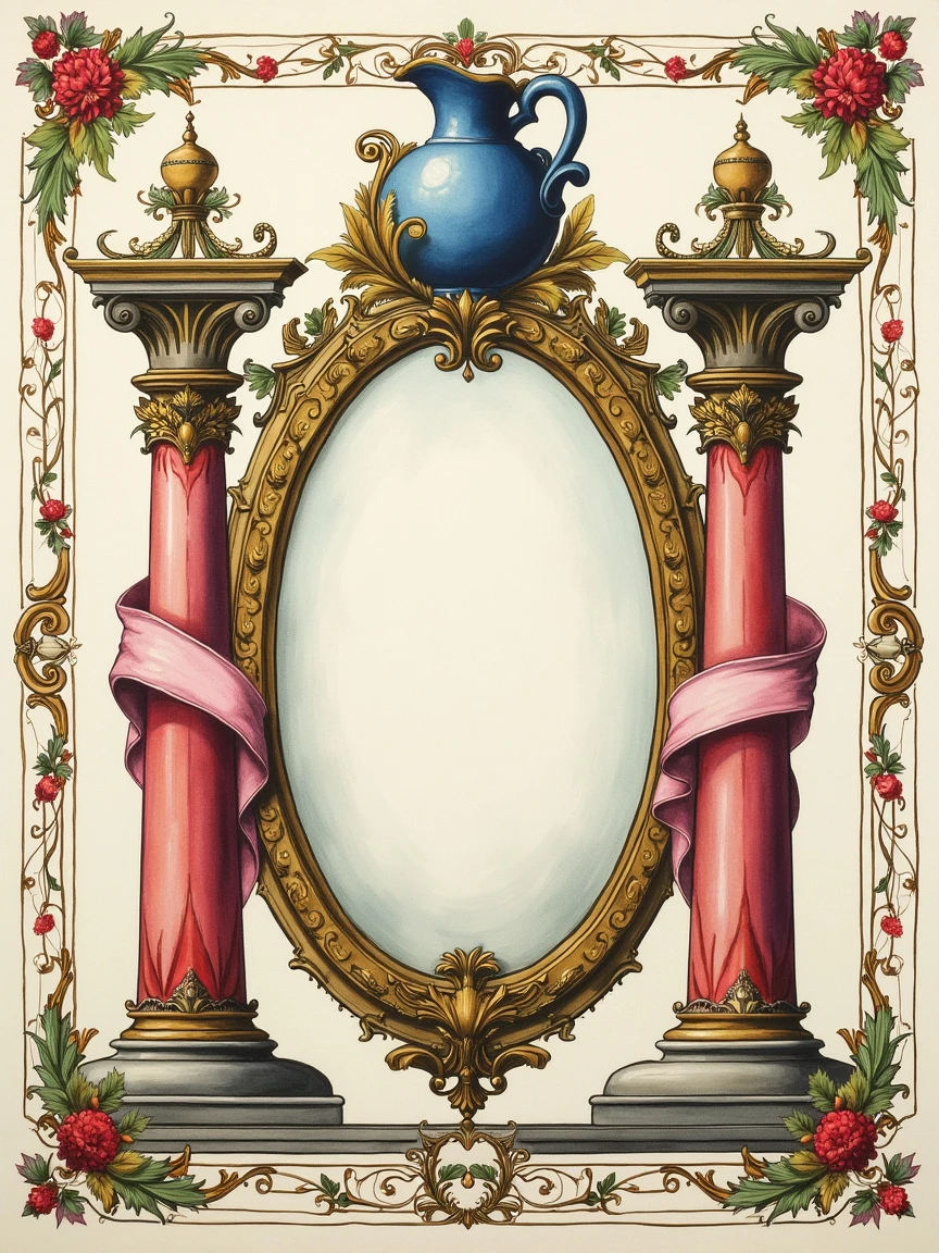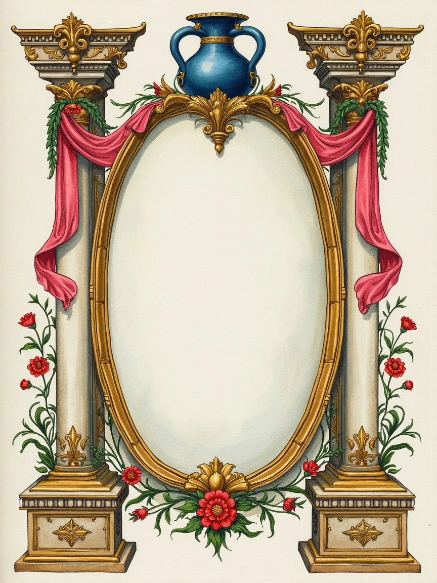 A design of an oval mirror surrounded by two pillars with decorative borders, painted in watercolor and gold on white paper, inspired by the medieval manuscript style, decorated with floral motifs and green foliage. A pink banner hangs between each pillar with red flowers at its edges. A blue vase is placed above the frame of the mirror, and ornate designs and patterns adorn the border on both sides of the artwork.
