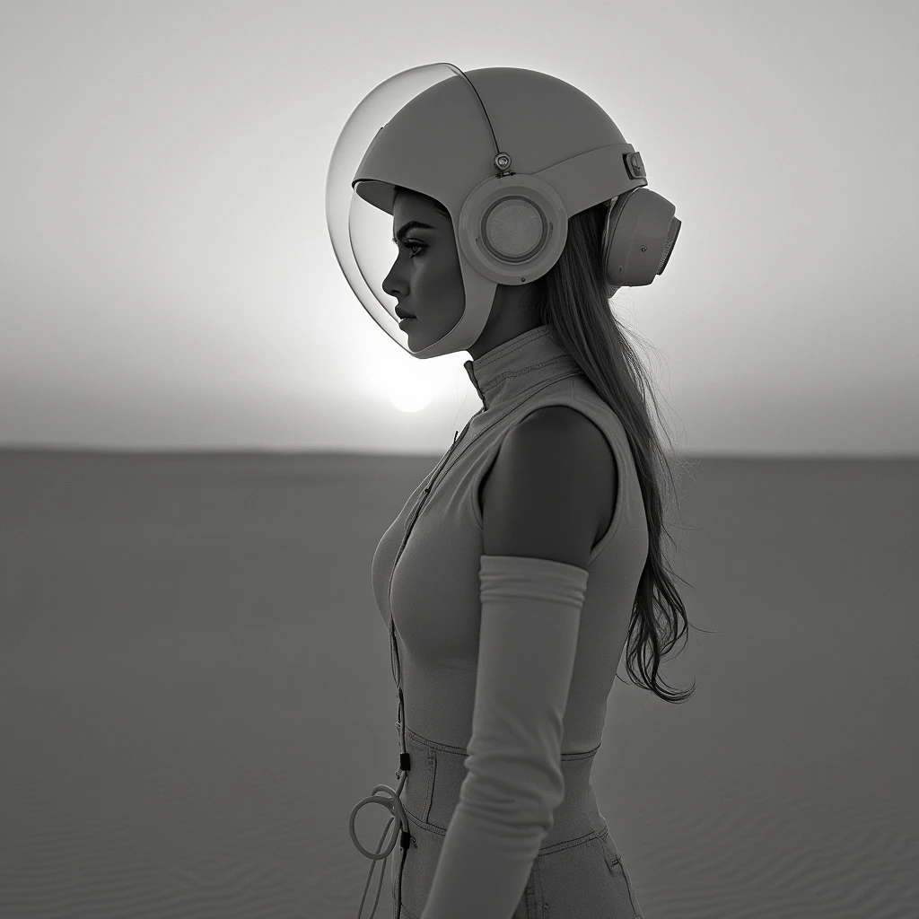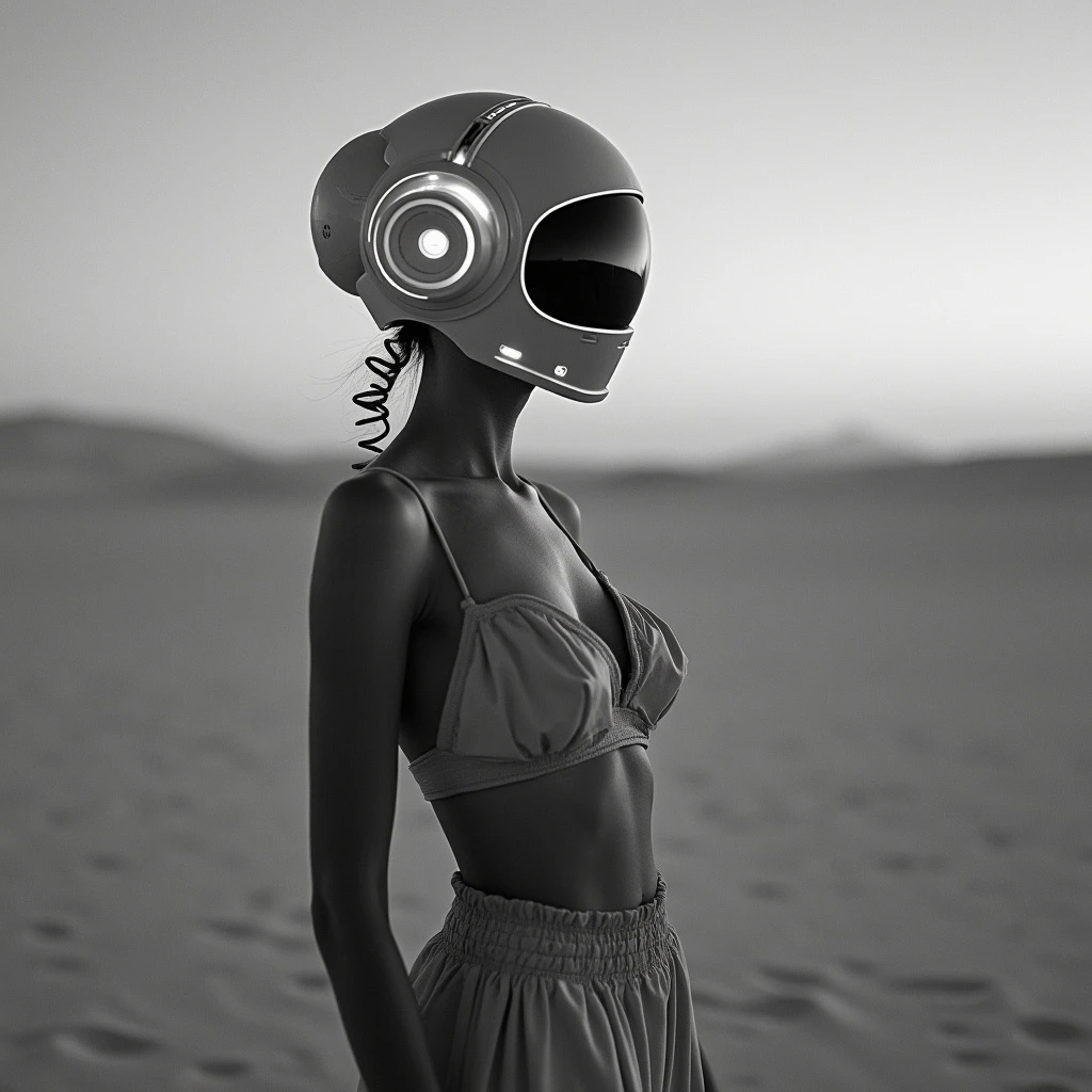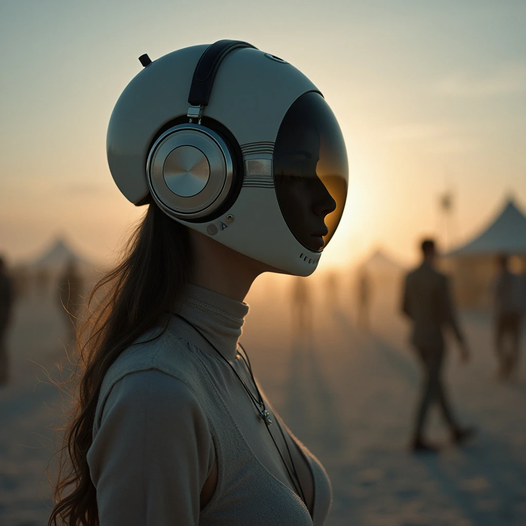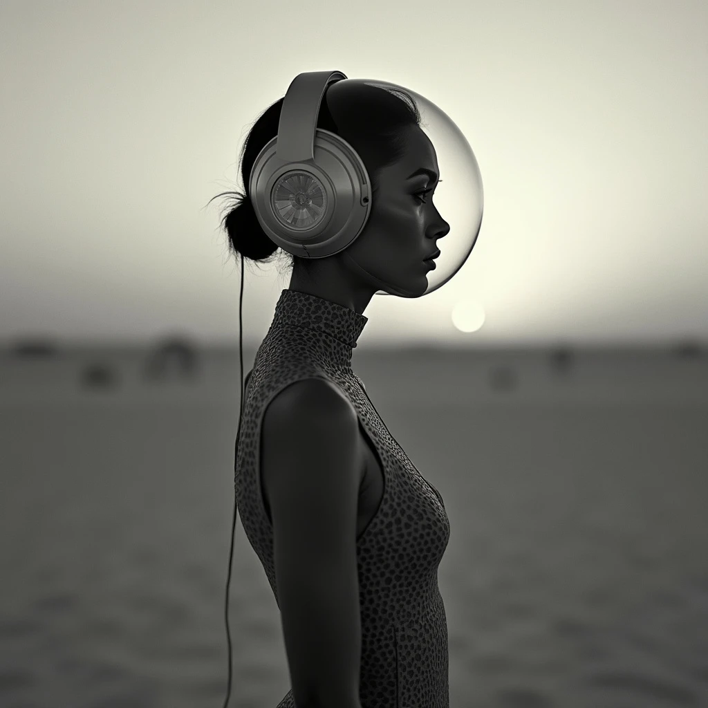 monochrome shadow-like fashion full body i have no soul an desert dusk an music festival Burning Man light glowing through view in the retrofuturistic electronic device ank a reaalistic beautiful woman in a retro minimalist futuristic hybrid of Retro minimalist headphone and puffed radio speaker bubble robot helmet blind plastic made of translucency transparencies and glass plastic with buttons hybrid, Must feature curved, organic shapes and high-gloss finishes, style surreal Avant garde photo realistic clean picture full body length 55mm lens, f/1.8, accent lighting, fujifilm pro 100H