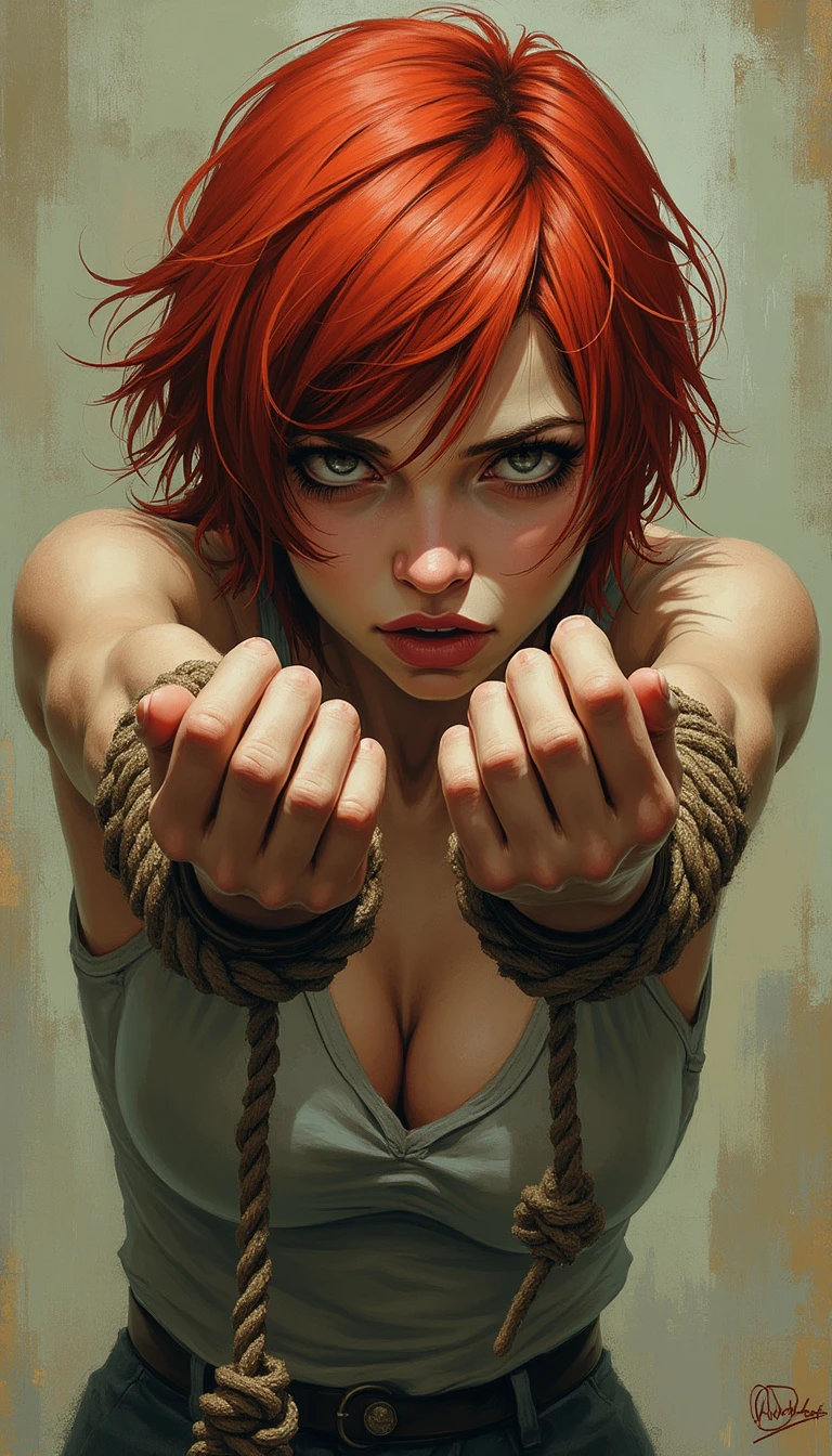 Matte finish. Concept art. Hyper detailed. HP Lovecraft Style Sketch. Muted Pastels. A woman with choppy, layered, short bright red hair, arms reaching forward to show rope binding both wrists. Dark outlines. Eyes in Sharp Focus. Background out of focus.