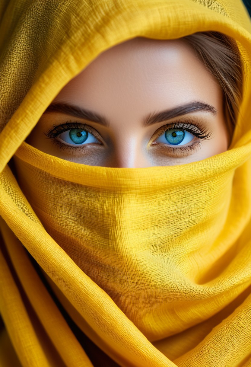 A close-up portrait of a woman's face with vivid blue eyes, wrapped in soft, flowing yellow linen. The linen frames her eyes in a v shape , drawing attention to her striking eyes. The image is in full color, with the linen in shades of yellow, contrasting against the natural skin tone. The overall mood is mysterious and captivating, with attention to detail in the texture of the fabric and the intensity of her gaze