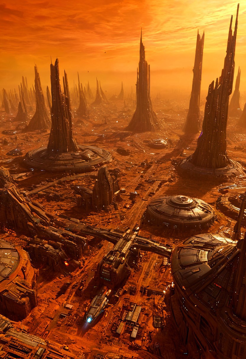 ultra HD, high quality, 4K, score_9, score_8_up, score_7_up, photo, extremely detailed, 8k, high quality, Source_photo, real photo, sharp, highly detailed and hyper realistic,masterpiece, masterpiece, best quality, vivid colors, high quality, RAW photo, alien landscape, skyline . extraterrestrial, cosmic, otherworldly, mysterious, sci-fi, spaceships. interstellar war, highly detailed. very slightly orange-tinted sky. Cyberpunk alien city merge , detailmaximizer, midjourneyv6.1,