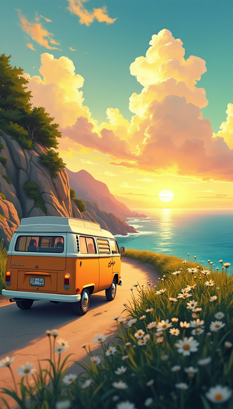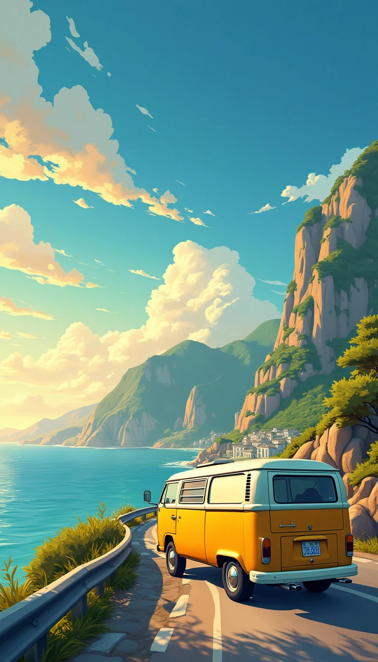 A anime illustration with intricate cartoonish finishing. A yellow and white campervan driving along the coast, during the golden hour, creating a beautiful, picturesque landscape. Hayao Miyazaki, Hiroshi Nagai, Hergé and Studio Ghibli. High resolution, ultra detailed, high quality, high sharpness, high contrast, beautiful, high octane render, high definition.