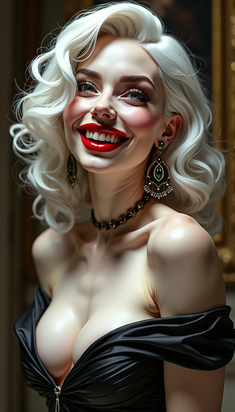 A hyper detailed illustration of a woman. The woman has serpentine eyes, and red lips. She is smiling, showing dangerous fangs. Ultra HD. Fantasy. Glossy image. High Gloss. High Contrast. Reflective. The woman has porcelain skin and pure white hair. Her hair is curled like a glamorous Hollywood starlet. The attitude is arrogance and wealth. She is wearing a long dark satin evening gown. Full body portrait. The setting is in a wealthy manor.