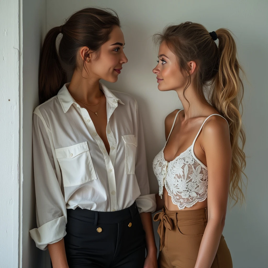 a photograph of two college women standing across from one another, the women are slender beautiful and perfectly proportioned, one woman is leaning against the wall and has long wavy blond hair draped over her shoulder, she's wearing a stylish lacy button-up shirt and leggings, the other woman has darker hair in a ponytail, she's wearing a stylish sleeveless shirt and a skirt, both women are looking at one another with longing expressions, photo-realism, high detail, 4k, realistic, eye contact