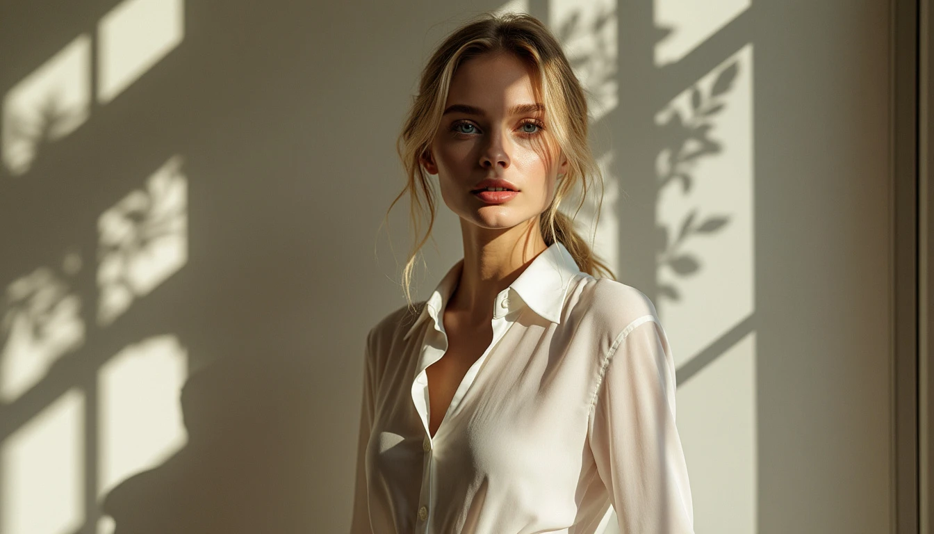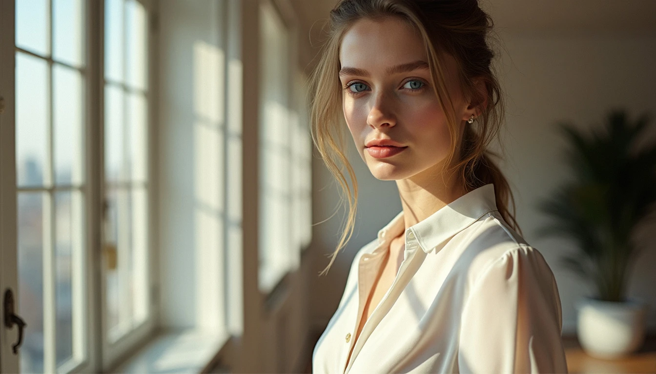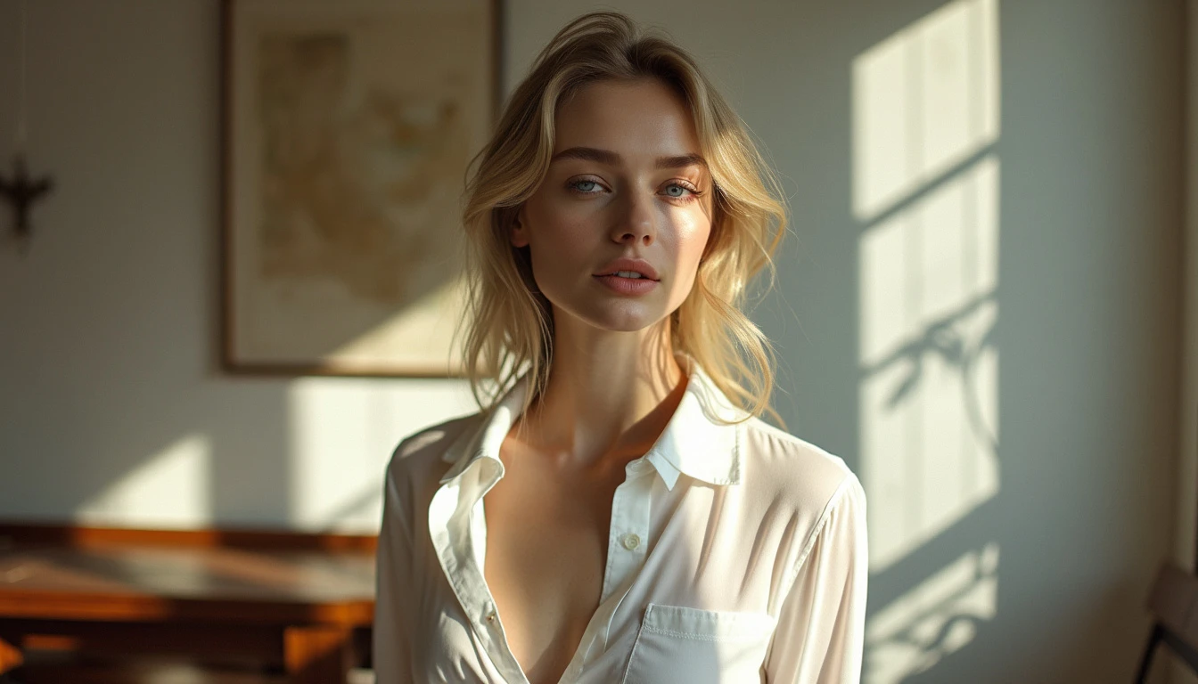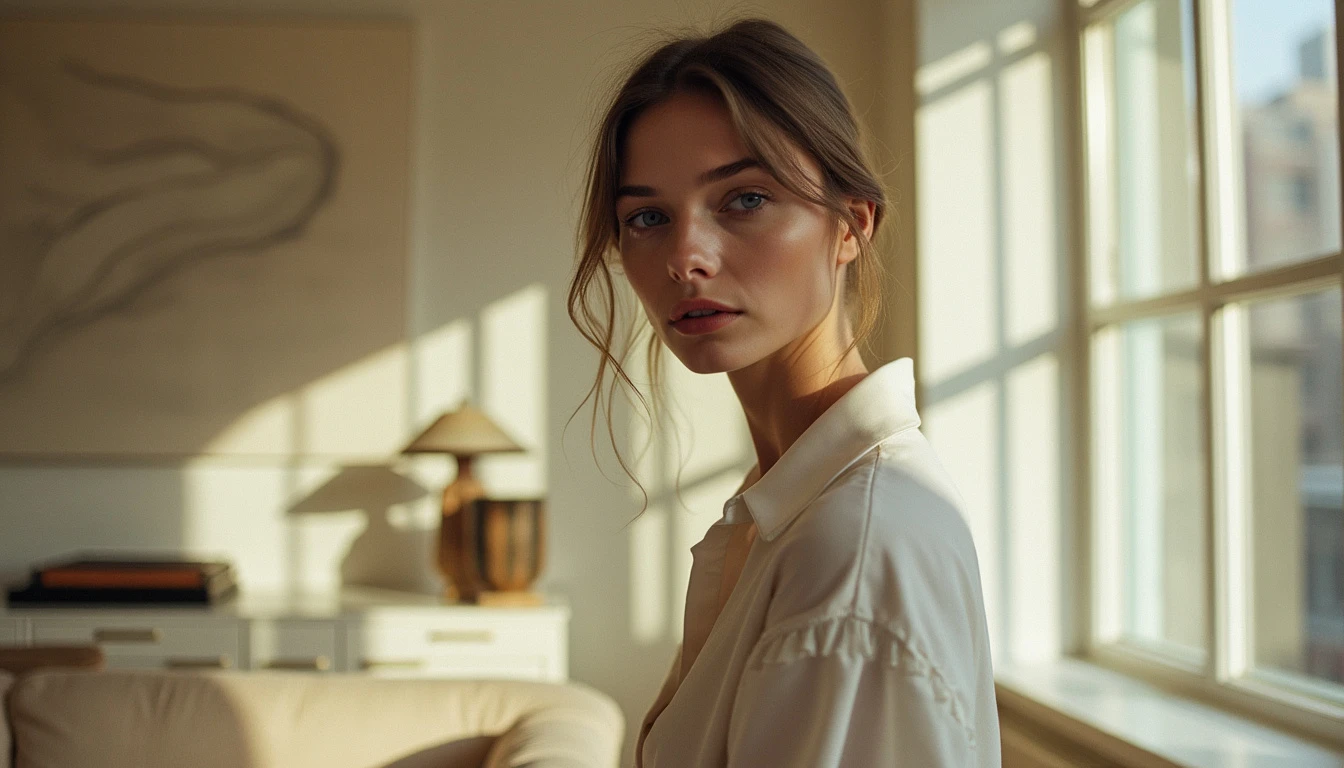 A stunning high-quality photo In Helmut Newtons iconic photography style ((Mild vintage color whiteshed Ultra Long Exposure Photography old Photo Realistic Leica 24mm lens)) She is dressed in a white blouse chic elegance couture clothing sleek and Influencer with a sophisticated modern New Yorker aesthetic captures a chic young woman her blue eyes, a sophisticated modern New Yorker, standing in a beautifully decorated minimalist design apartment . Sunlight filters through the canvases creating a dappled light effect that plays on her face and casts long shadows on the The large canopy window design, exuding elegance and style. The large apartment showcases an incredible minimaliste aesthetic, with a blend of contemporary and classic elements, reflecting her extraordinary taste. The New Yorker background adds an air of sophistication, making this photograph a perfect choice for a blog homepage.
