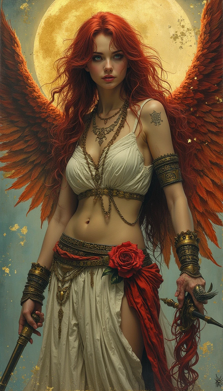 poster artwork for a play on a Rebel Angel character; heavily influenced by Frazetta , Corben, Johfra, Maxfield Parrish, Kubin, Böcklin, Vrübel ;ink in water, on paper, outrageous detail, opacity and filaments, non-mixing coloured oils, alcohol and gold leaf technique