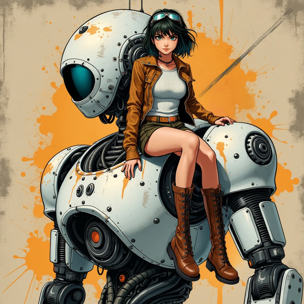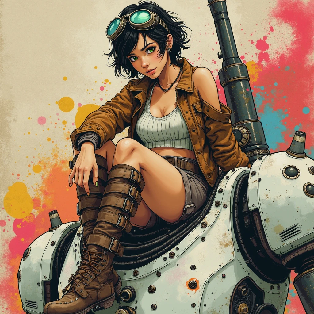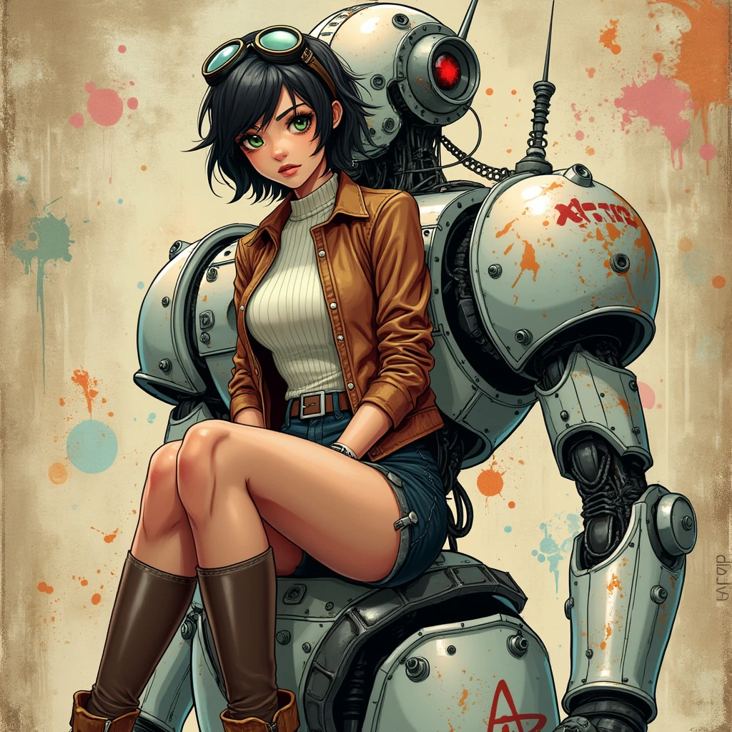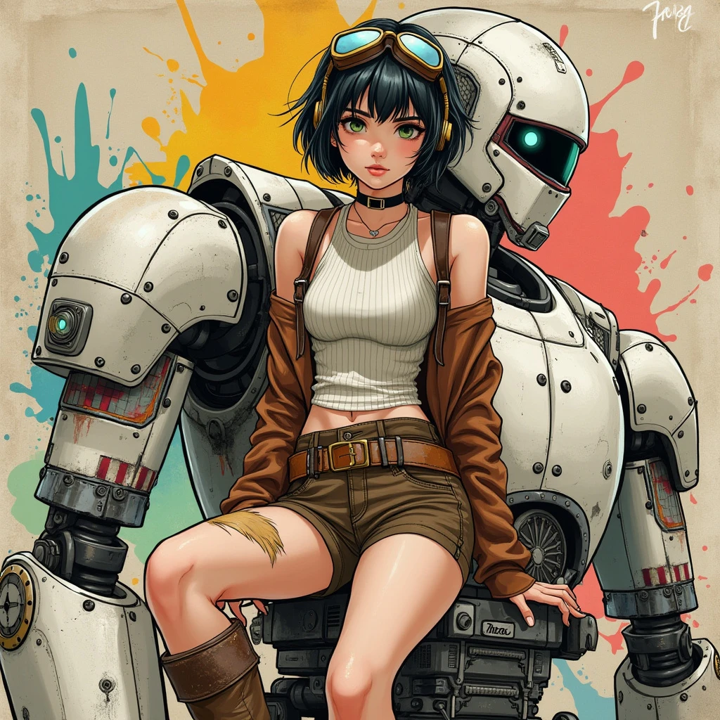 A drawing of a 18 year old woman sitting on the shoulder of a giant robot, styled with a mix of decopunk and graffitipunk elements. The woman has short dark hair and green eyes, she has goggles resting on her head, she is wearing a ribbed white sleeveless shirt under a brown leather jacket, she's wearing brown shorts knee high socks and leather boots, she has a tool belt. The background is a grungy, vintage texture with vibrant, colorful graffiti splashes. Created using ink and digital overlays, tech patterns, geometric shapes, bold graffiti strokes, distressed textures, metallic highlights, vibrant colors, hd quality, vivid style. The robot is a patchwork of steampunk and high tech, it is mostly white but with black and chrome segments
