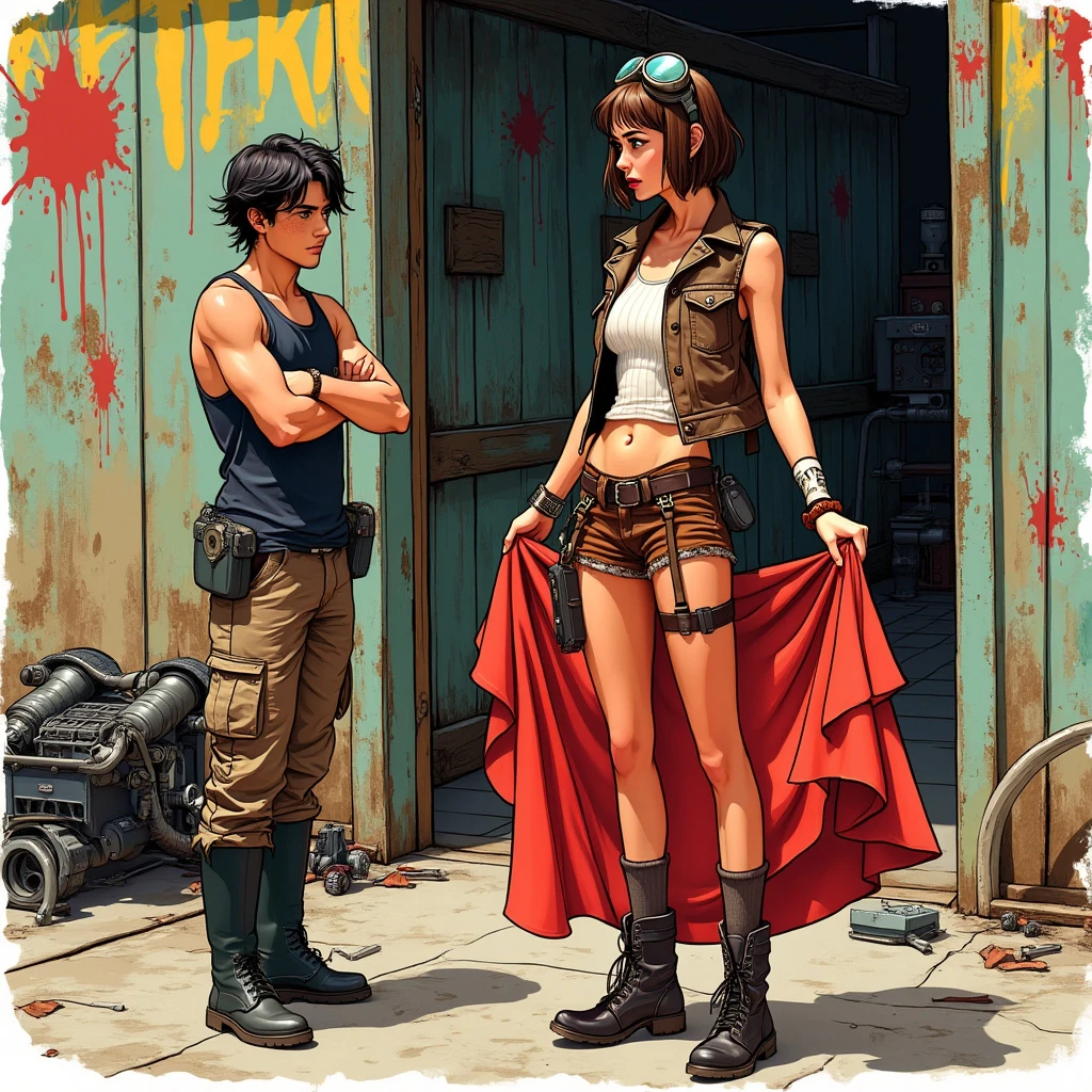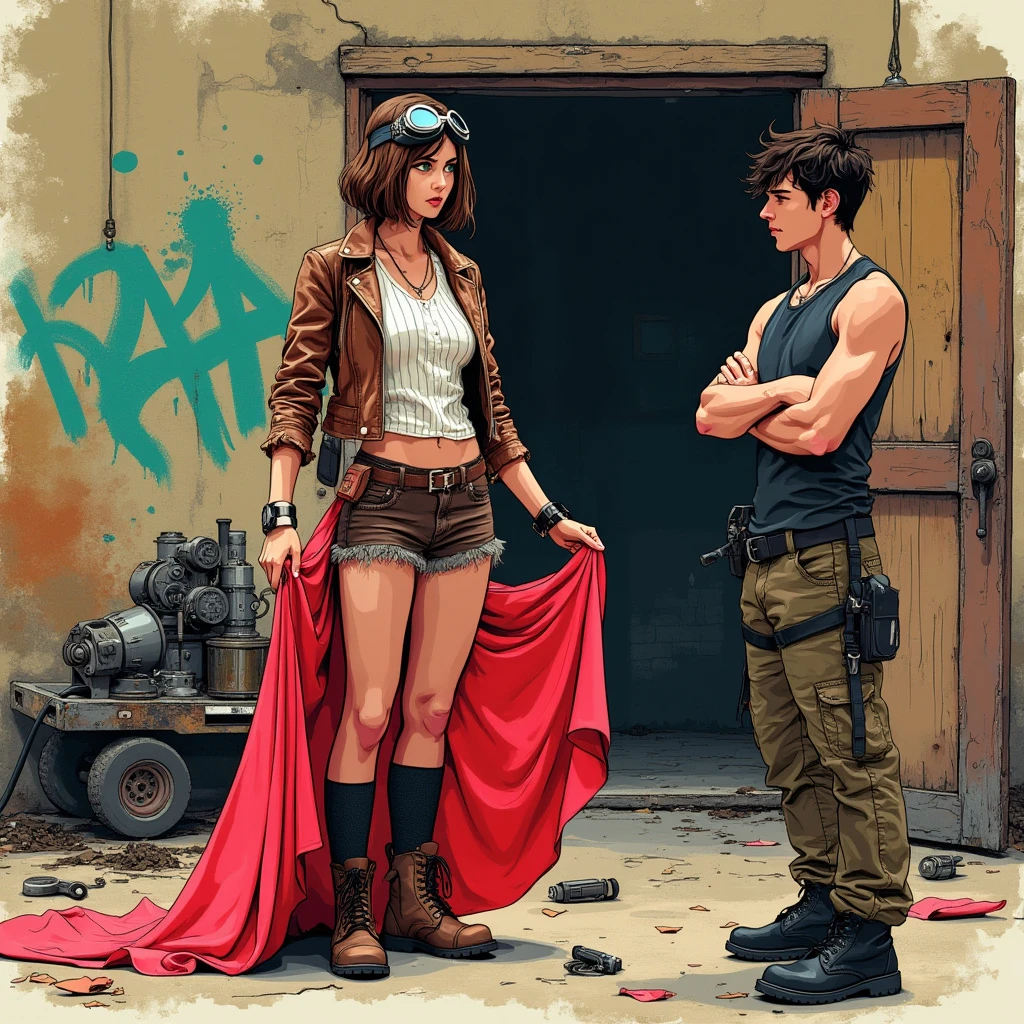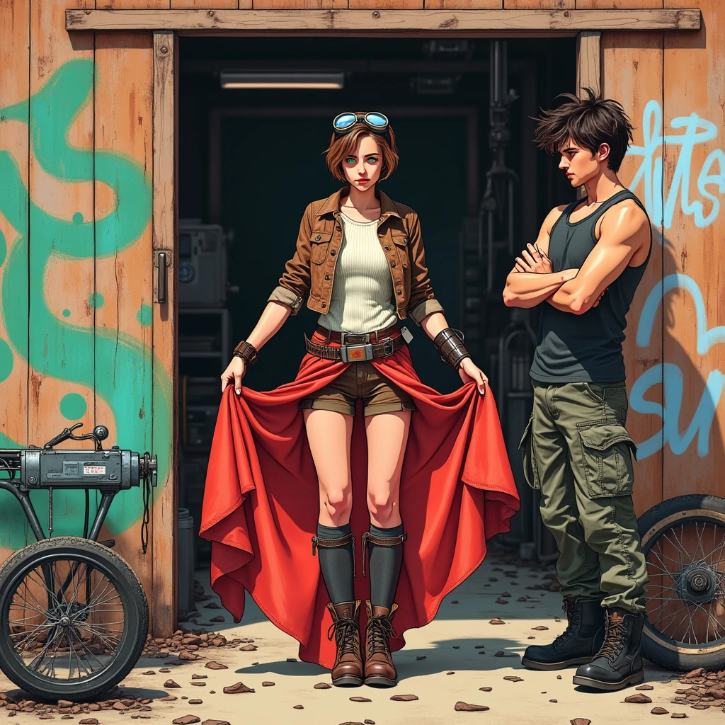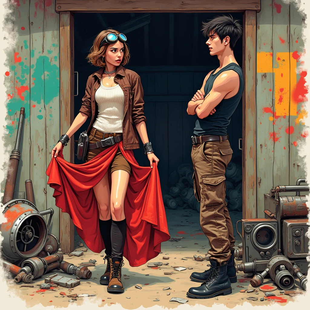 A drawing of a 18 year old woman standing outside a old wooden shed with broken machinery around it, styled with a mix of decopunk and graffitipunk elements. The woman has short brown hair and green eyes, she has goggles resting on her head, she is wearing a ribbed white sleeveless shirt under a brown leather jacket, she's wearing brown shorts knee high socks and leather boots, she has a tool belt, she is 165 cm tall. She is standing holding a beautiful tight shimmering red evening gown out in front of her with both hands. She has a confused expression. The background is a grungy, vintage texture with vibrant, colorful graffiti splashes. Created using ink and digital overlays, tech patterns, geometric shapes, bold graffiti strokes, distressed textures, metallic highlights, vibrant colors, hd quality, vivid style. The steampunk and high tech equipment are scattered on the ground and in a cart. A man about 21 years old with messy dark hair is near the woman looking at her, he is 180 cm tall and is wearing a torn dark tank top and cargo pants, with black boots. The man has his arms crossed and a proud look on his face. He is clean shaven.