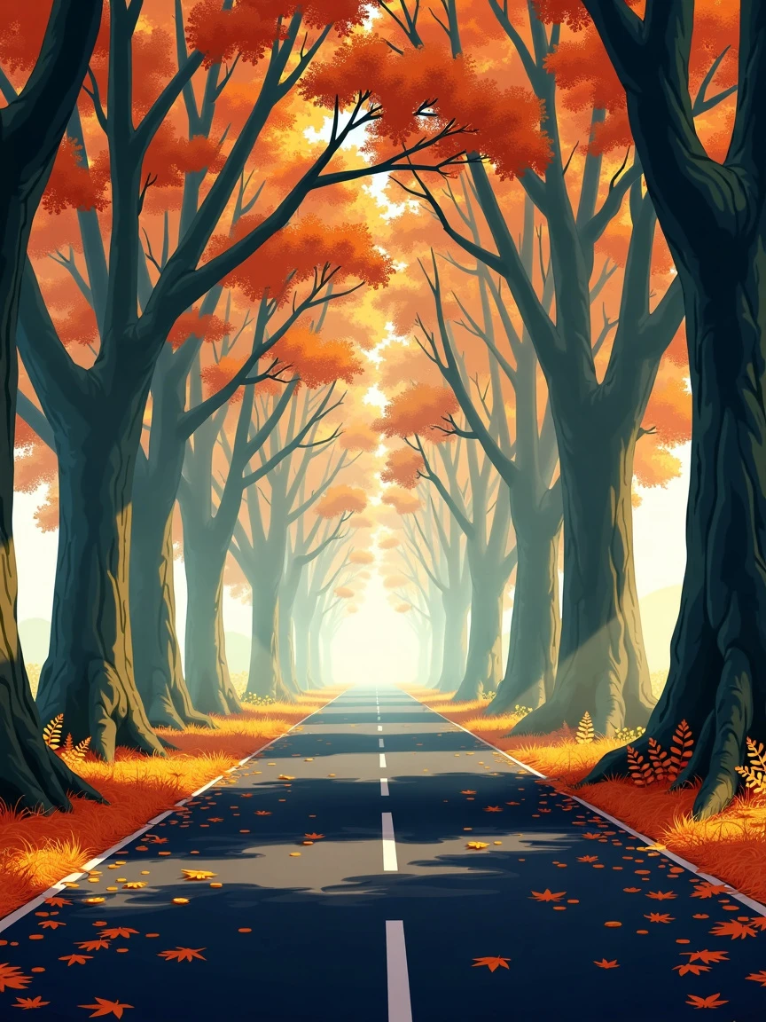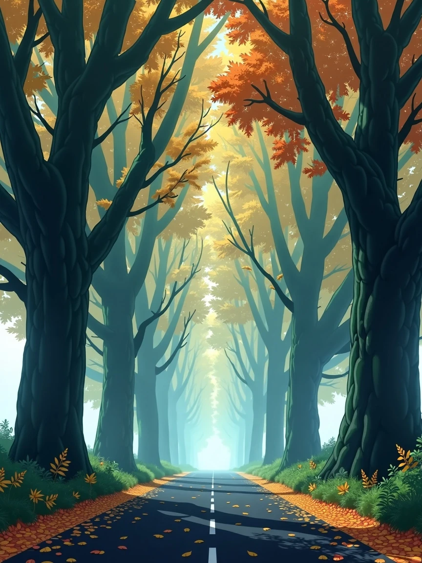 An anime illustration of a misty morning in an autumn forest with towering oak trees lining a dark black asphalt road. Sunlight filters through the trees, creating an ethereal glow. The scene is peaceful, serene with autumn colors. Hayao Miyazaki, Hiroshi Nagai, Hergé and Studio Ghibli. High resolution, ultra detailed, high quality, high sharpness, high contrast, beautiful, high octane render, high definition.