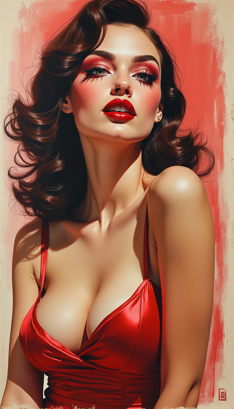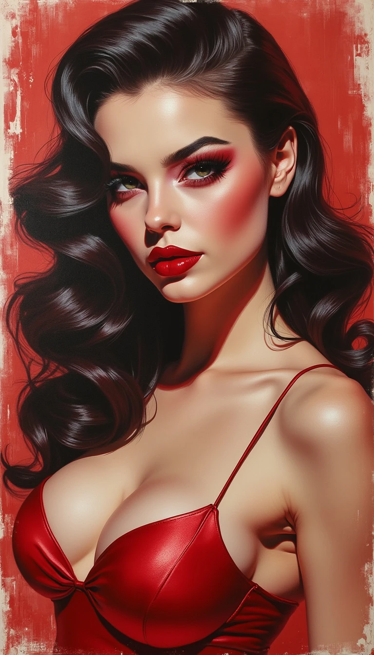 Sketch in the style of a modern pinup poster. Very detailed. Matte color. High Contrast. Oil Pastel. A woman that is the personification of Cherry Soda. Satin. Red smokey matte makeup.