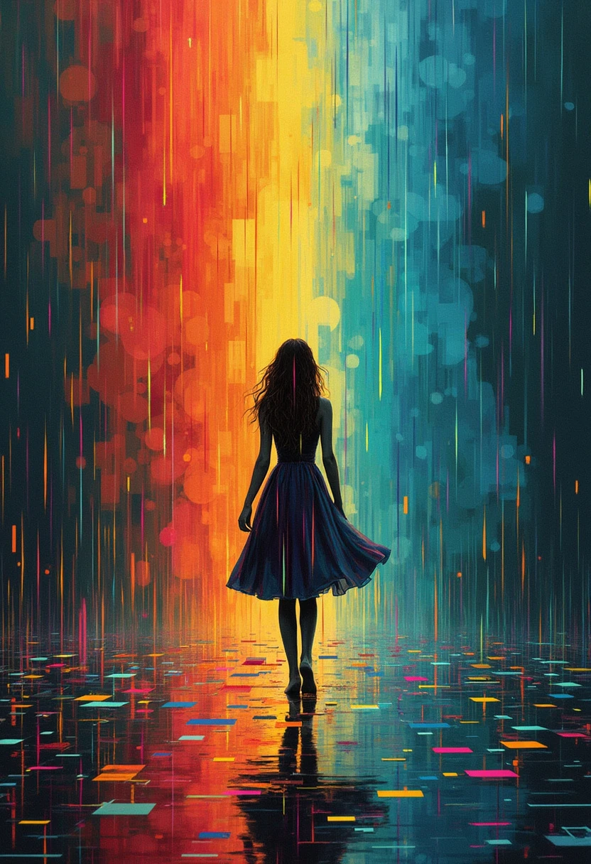 A woman in a dress. frottage style, rain, unsigned, transcendent, colorful pixelation, radiant, feedback loop, hallucinatory. Geometric Shapes. Sketching.