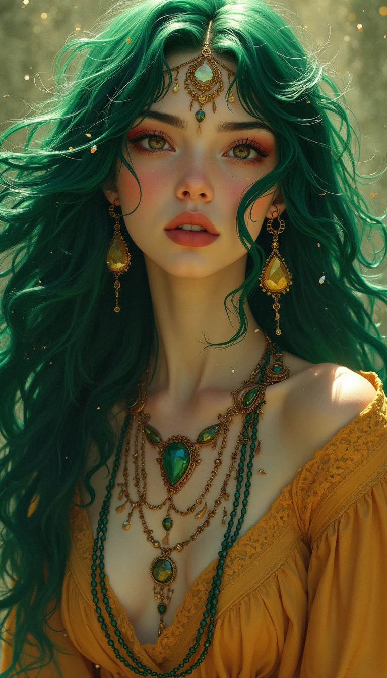 Style of Shaun Tan, Style of Sylvain Sarrailh, Style of Nicola Samori A woman with intricate jewelry in her green hair. Sheik. Gypsy. Wavy hair. Flowing garment. Upper body. Shimmer.