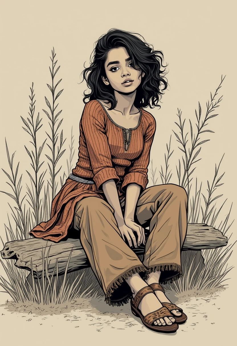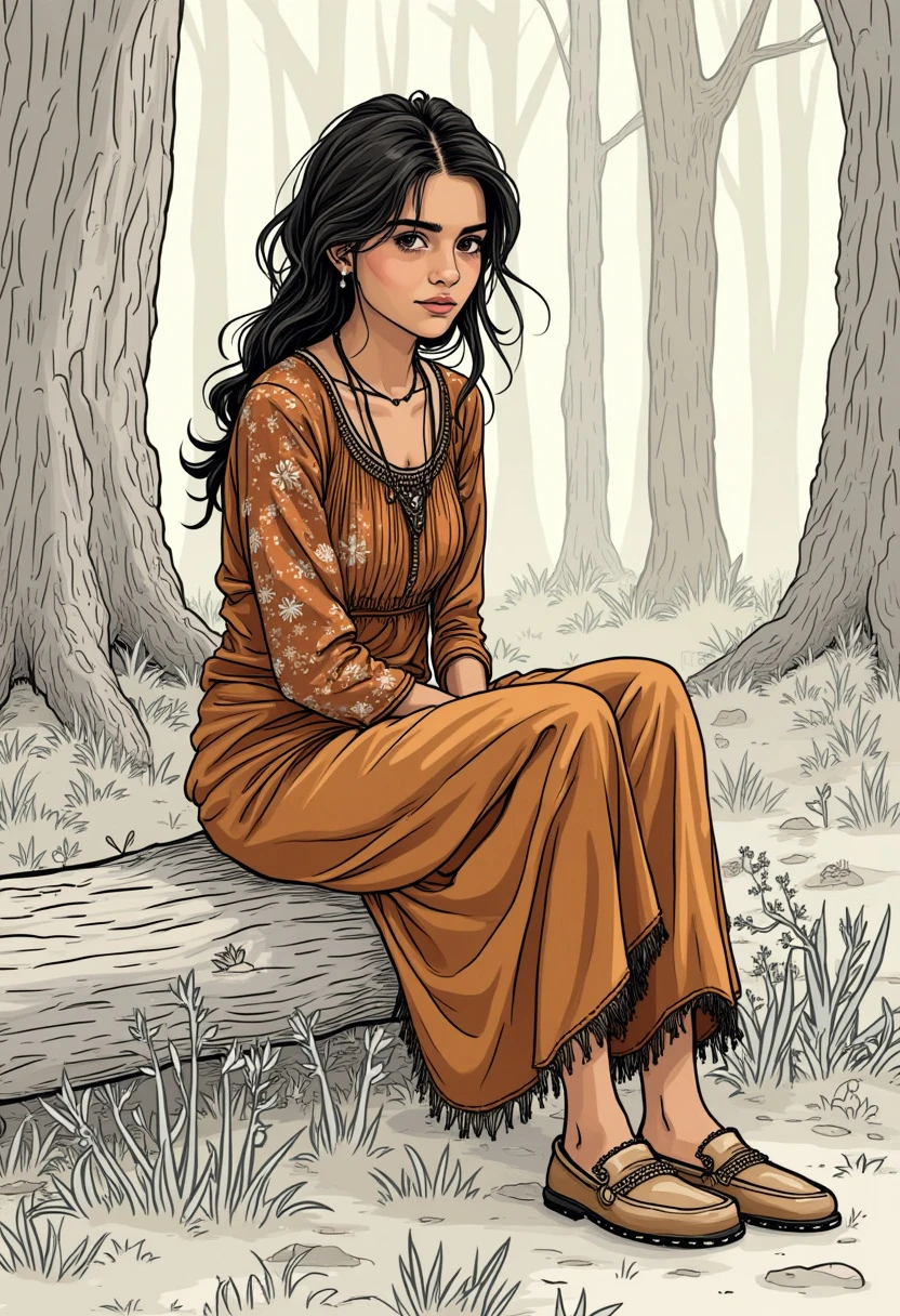 in the Art Style of "Wireframe Drawing": full figure of an 18 year old teenager with Arabic features. Tan. Shadaria Kalil is petite. She is thin but scrappy. She resembled Sarah Hyland’s face, with thick bushy eyebrows and slightly unkempt brown hair. She is very earthy and dressed in a bohemian style. She is a Wiccan. She wears a long sleeved ribbed top, with a burnt orange floral dress over top. She wears brown burlap pants, and moccasins. Sitting in a outside in the forest. black and white, thick lines thickness, monochromatic, dashed lines style, neutral background