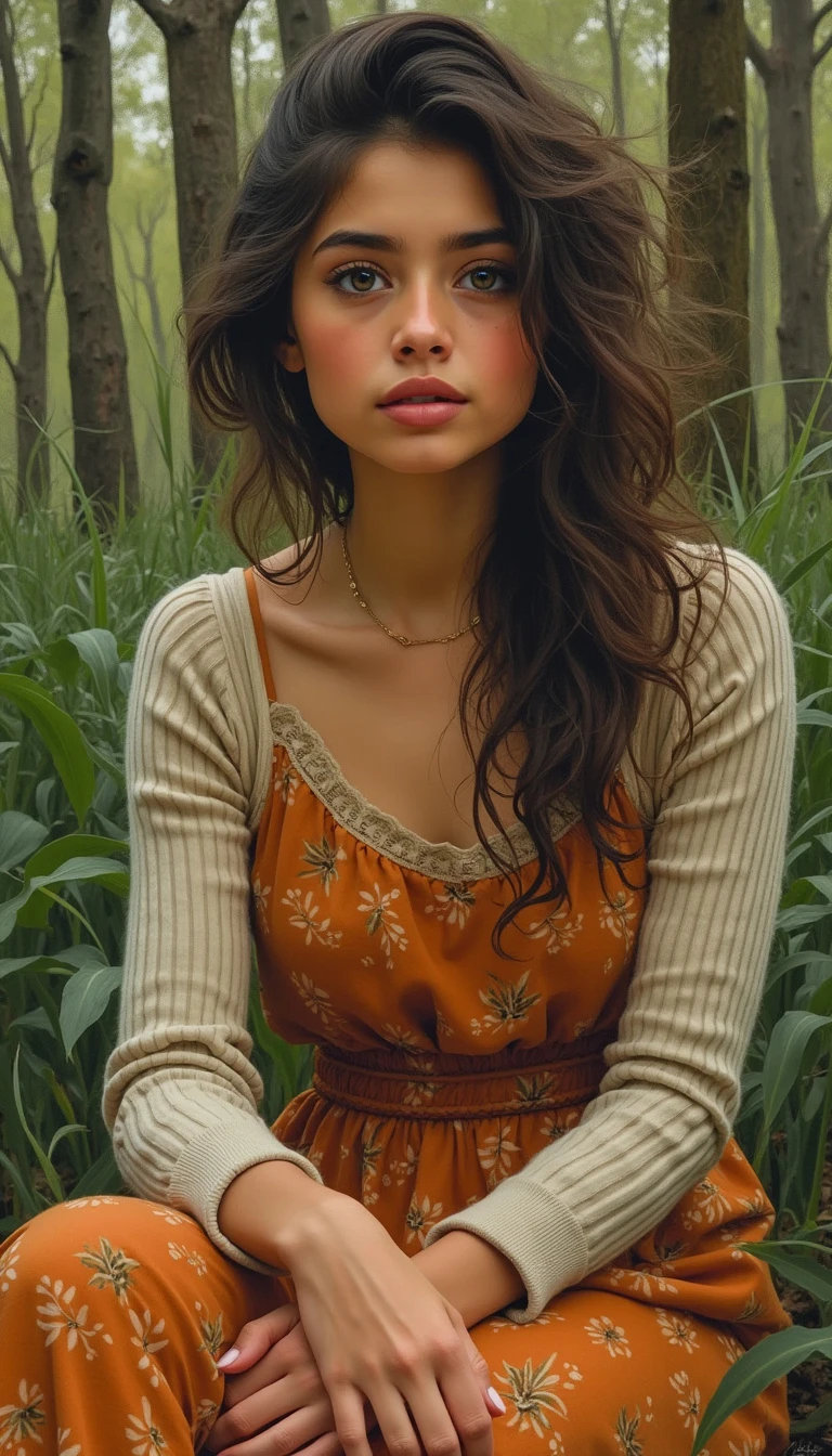 triptych style, by Ata Kandó. Style of Élise L'Heureux. Painting. Oil Pastel. Close up face. A 18 year old with latina features. Tan. Shadaria Kalil is petite. She is thin but scrappy. A vagabond with thick bushy eyebrows and slightly unkempt brown hair. She has olive green eyes. She is very earthy and dressed in a scrappy style. She is a Wiccan. She wears a long sleeved ribbed top, with a burnt orange floral dress over top. Sitting in a outside in the forest.
