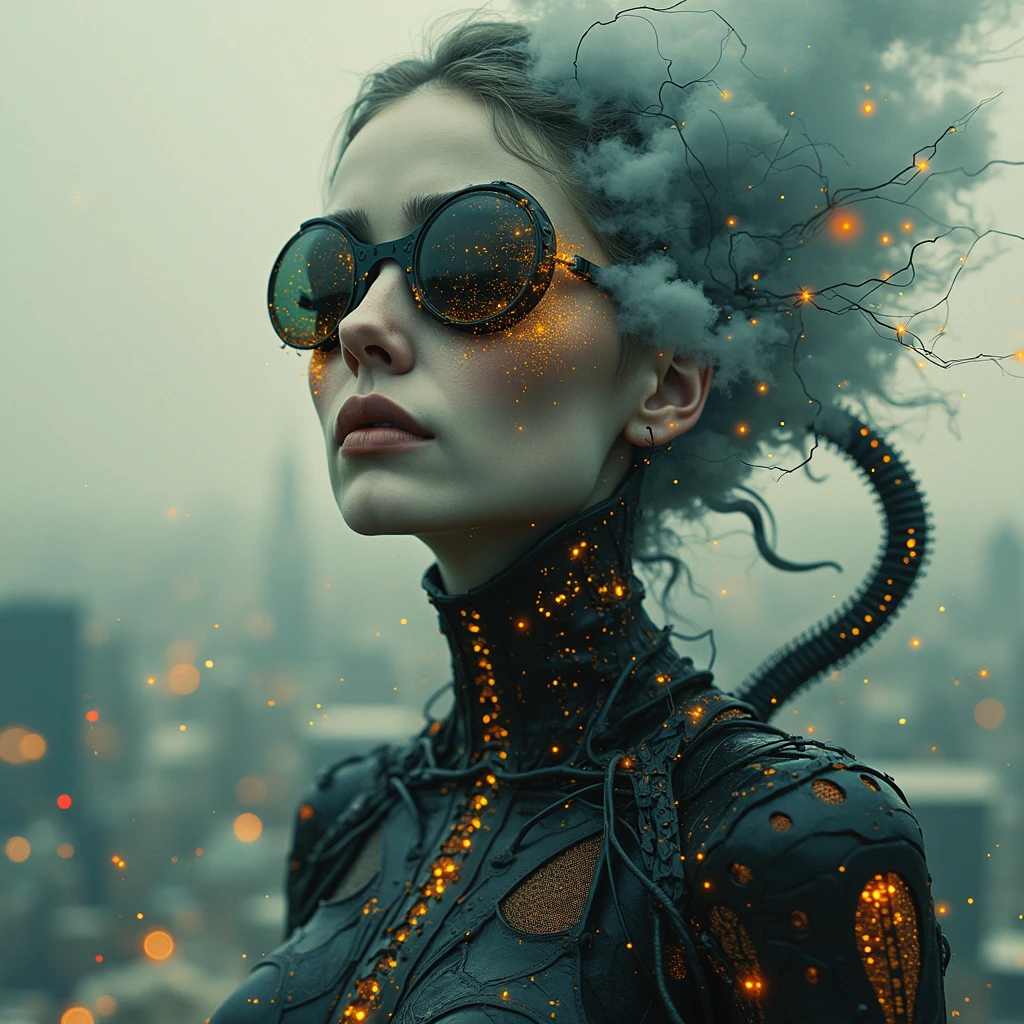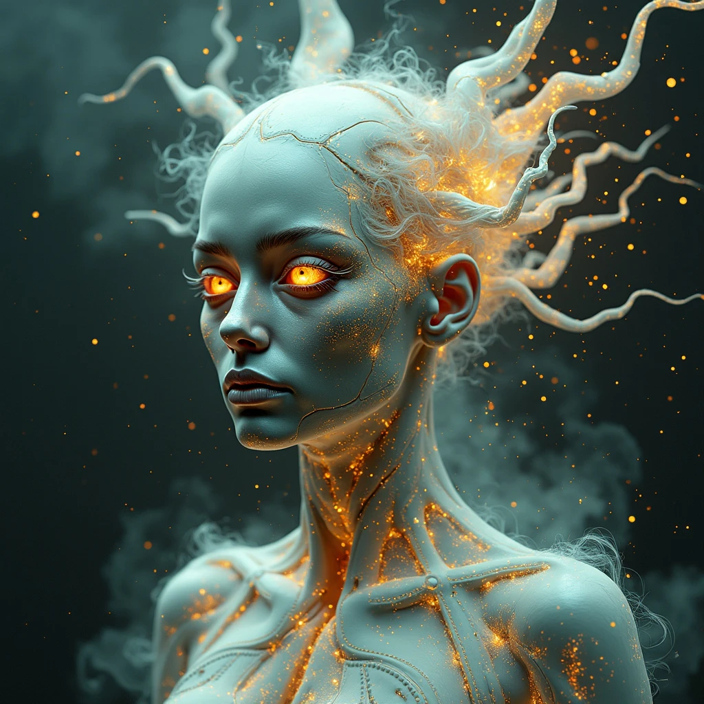 double exposure, city, strange woman with glass eyes, smirk, fiery patterns, exoskeleton consists of white electric, dark fantasy, melancholy, black background with gold dusting, clouds of turquoise-black smoke, intricate, complex, glitch algorithm, noise, stereo effect, double fractal exposure, optical uncertainty, 3d illusion, deception vision, ultra realistic, highly detailed, post apocalyptic