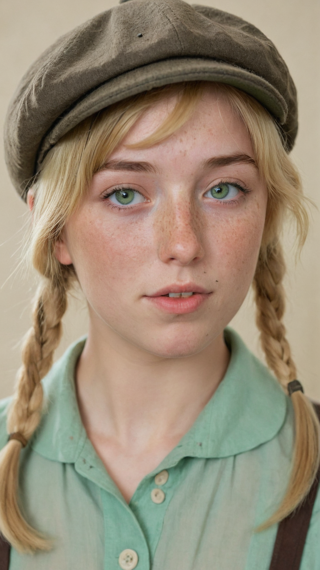(derpy:1.2) 22 year old blonde woman with adorable freckles, green eyes, narrow button nose, wearing 1920s newsboy clothes, brown newsboy cap,