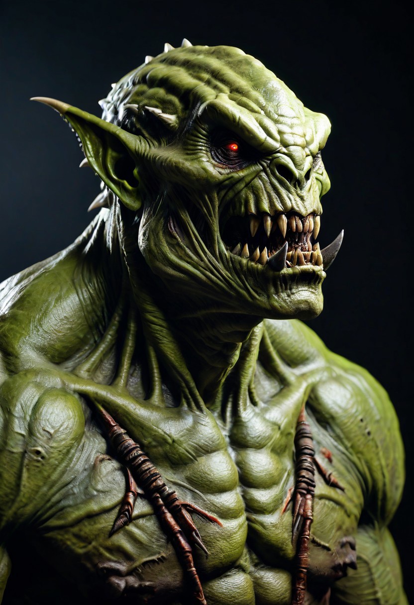 Frontal view, upper body view, Hyper-realistic photo, lifelike texture, grainy, cinematic, 4k, quality, detailed, impressive, wildlife animal shot, Photo of the hybrid: - Body Shape: The hybrid could have a stocky, squat orc body, but with some tyranid features such as a chitinous exoskeleton covering its chest and back. - Head: The face could combine the features of both races: the wide jaws and large teeth of an orc, but with the multifaceted eyes of a tyranid that glow with a bright color.