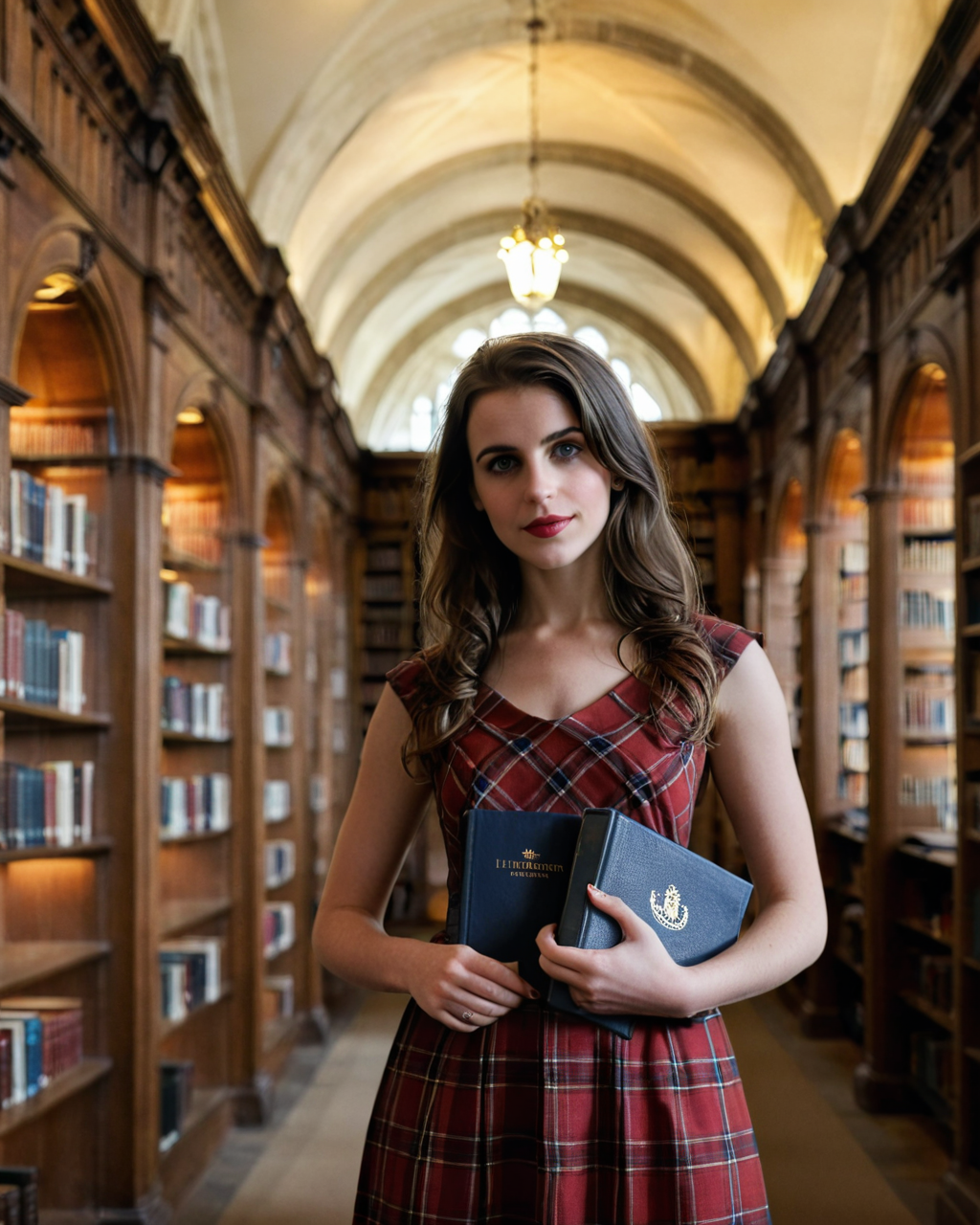 <lora:st3fj00st_46XL-000007:0.9>, a (medium close up) photograph of (beautiful 24 year old) (st3fj00st woman:1.1) as a librarian,wearing a red plaid dress,standing in a (library at Oxford University:1.3),holding an leather bound book,with long rows of bookshelves in the background,multi-level with (high arched ceiling:1.2),long dark hair,(smirk:0.8),lips,makeup and eyeshadow,photorealism,realistic lighting,(bokeh),realistic shadows,masterpiece,Award-winning photography,realistic skin texture,UHD HDR,8K wallpaper,Hyperrealistic, Hyperdetailed, subsurface scattering, heavy shadow, best quality, rule of thirds, Intricate, High Detail, 16mm, color graded portra 400 film, detailed pupils, 35mm photograph, professional
