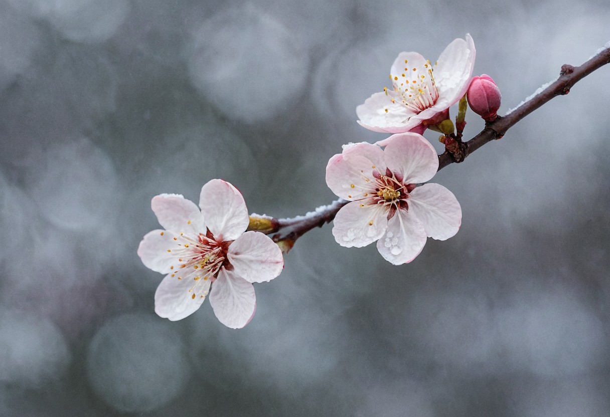 A delicate plum blossom blooming in the harsh winter, snowflakes gently resting on the petals, cold air creating a serene contrast, a minimalist design with soft negative space, muted pinks and whites