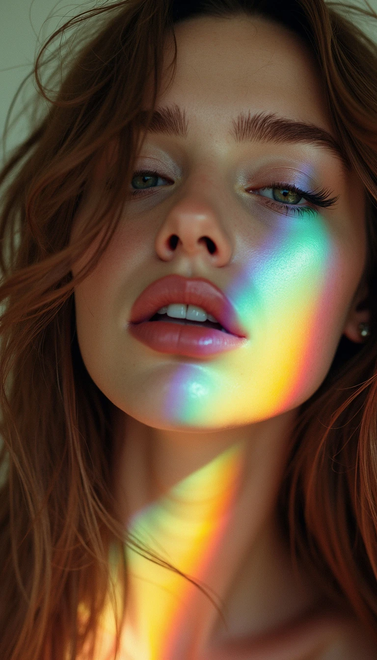 Fashion beauty editorial, extreme close-up of REBECCA FERGUSON, pale white skin complexion, pale mesmerizing light-green bedroom eyes with prominent limbal rings, well defined dark eyelashes, voluminous brown long hair styled in casual elegance, hair covering her face, sleepy facial expression, her thin lips slightly parted, head dropped back, looking away, windswept hair, Glowing bright white background. Her face is in dark shadows and partially illuminated by a diagonal strip of refracted light with multi-color rainbow edges, specular highlights on shiny skin, chiaroscuro.