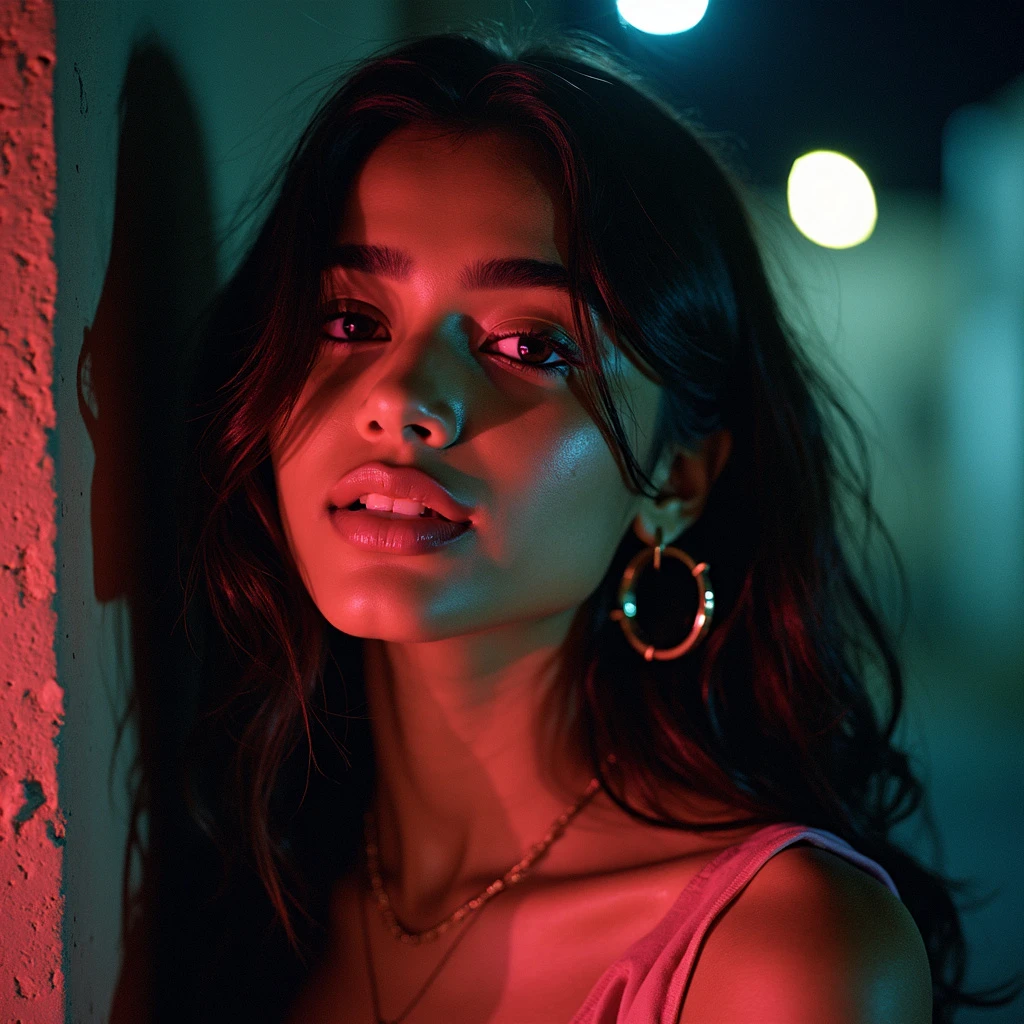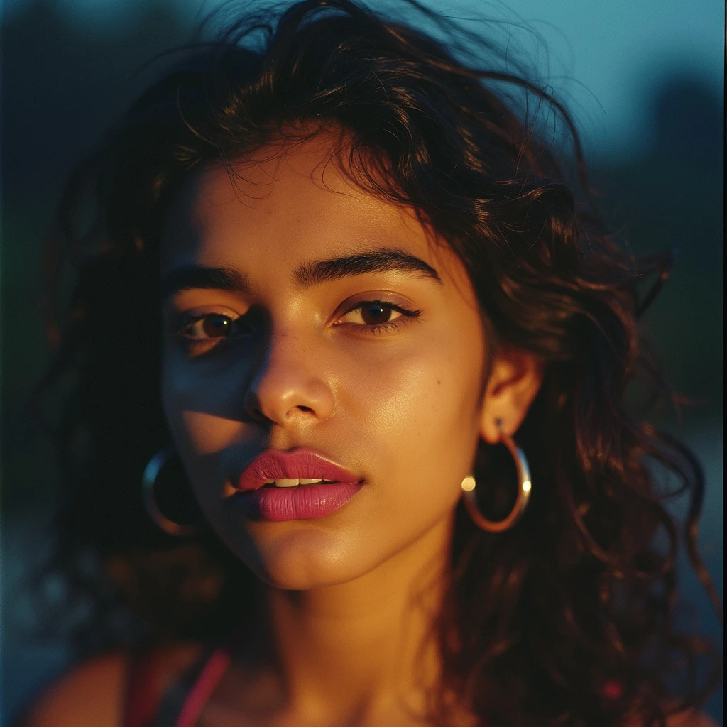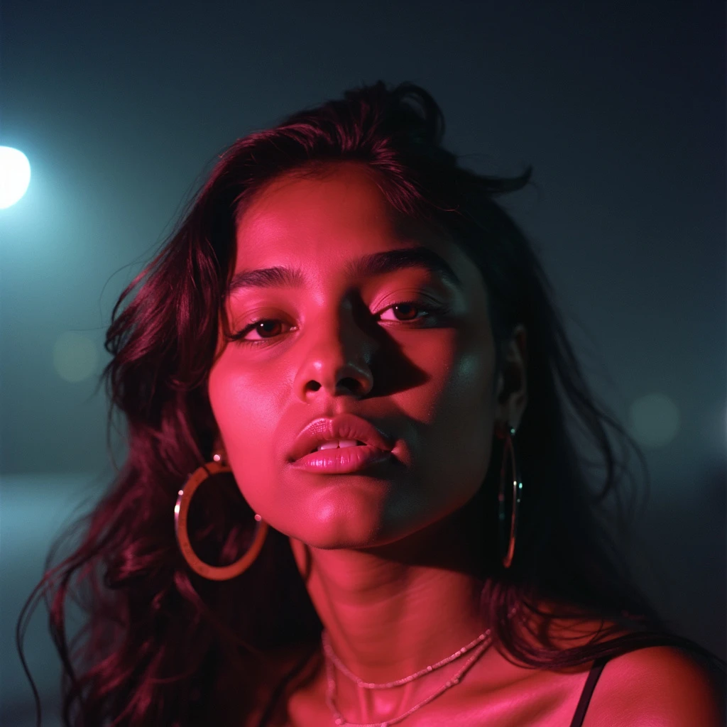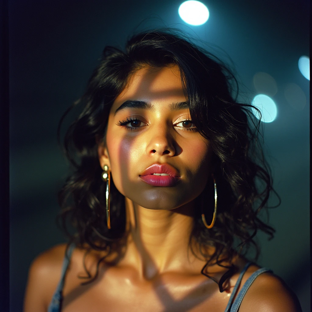 Movie still lomography, photo of beautiful 19 y.o latian/indian woman, shadow on face, no light, misty, night, hoop earrings, pink lipgloss, rounded cute face
