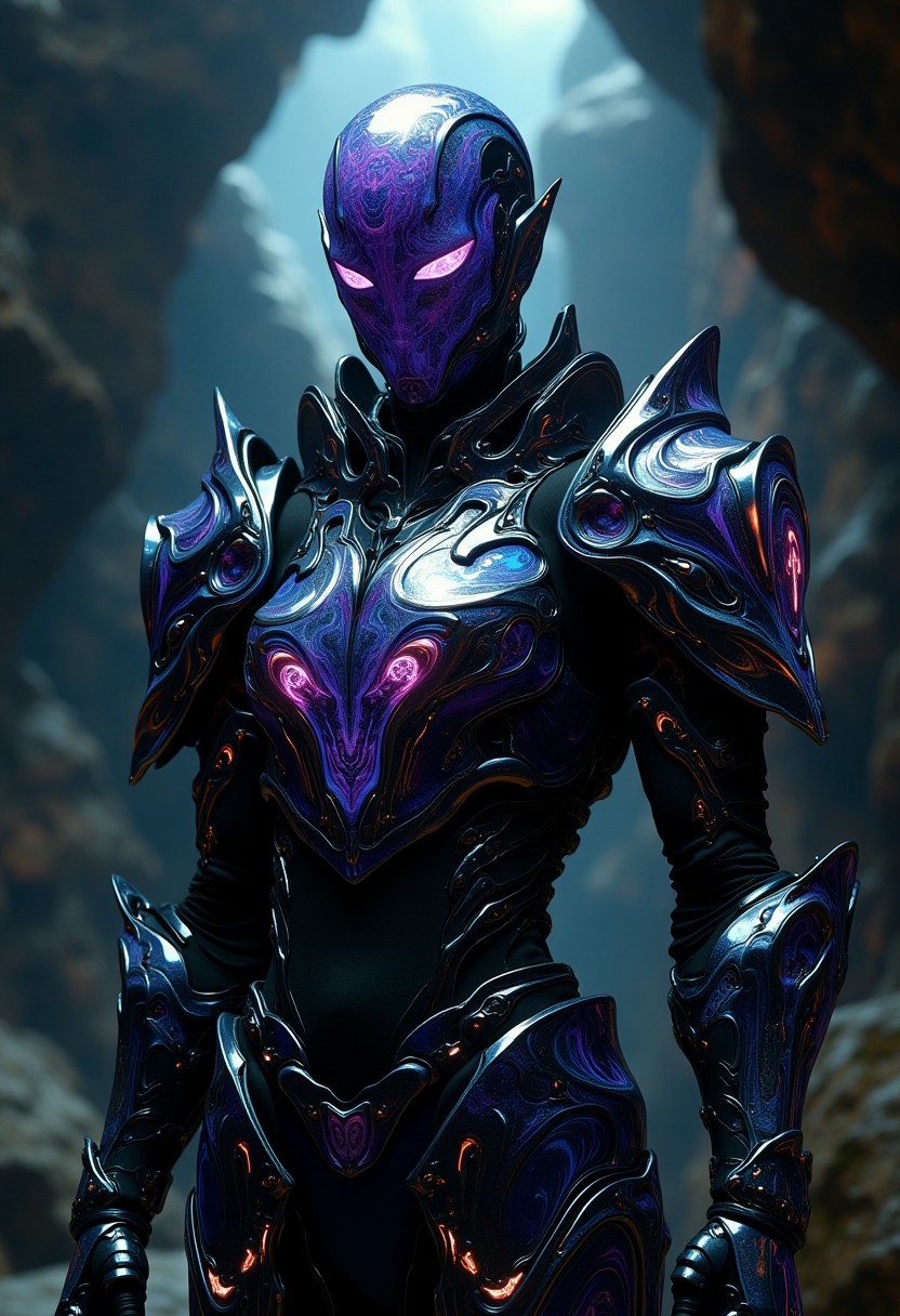 An armored golem (in warrior pose) wearing complete cyber-fantasy armor (full-head-helmet, pauldrons and so on...). Each piece of the armor is glowing of iridescent ink marbling in the style of FFAIM. Ray tracing and path tracing and glourious reflections and amazing indirect light from the armor itself casted on the grotto where the golem is just entered.