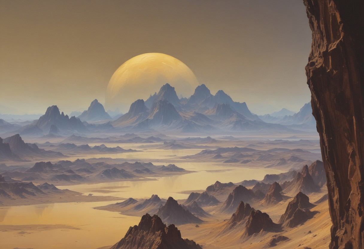 imagining of the view from one of Saturn’s moons. Misty atmosphere, yellow-hued sky, rugged mountainous terrain with sheer cliffs and terrible peaks, pools of bubbling acid, massive view of Saturn on the horizon obscured by the yellowish atmosphere.