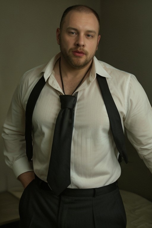 <lora:Untied_Tie:0.8>, photo of a chubby bald man, bearded, necktie, open dress shirt, dress pants, horny,