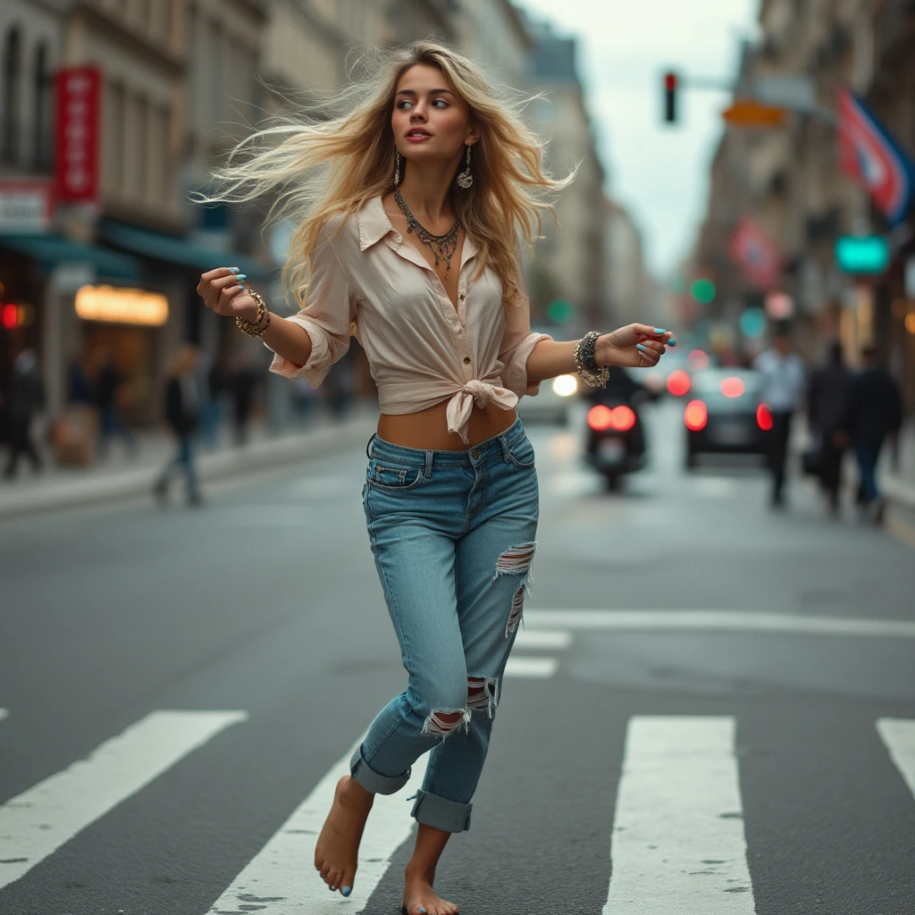 A photograph of a 21 year old woman dancing down the street, styled with a mix of decopunk and graffitipunk elements. The woman has long messy blond hair that is being blown by the wind and blue eyes, she is wearing a feminine button up top and distressed jean and is barefoot, she is 175 cm tall and has perfect proportions. Blue nail polish. She has a flirty expression. The background is a busy city street with traffic and pedestrians. The woman has anatomically correct hands. She is joyful as she dances. Full-length image. She is wearing a necklace, bracelet, and dangling earrings.