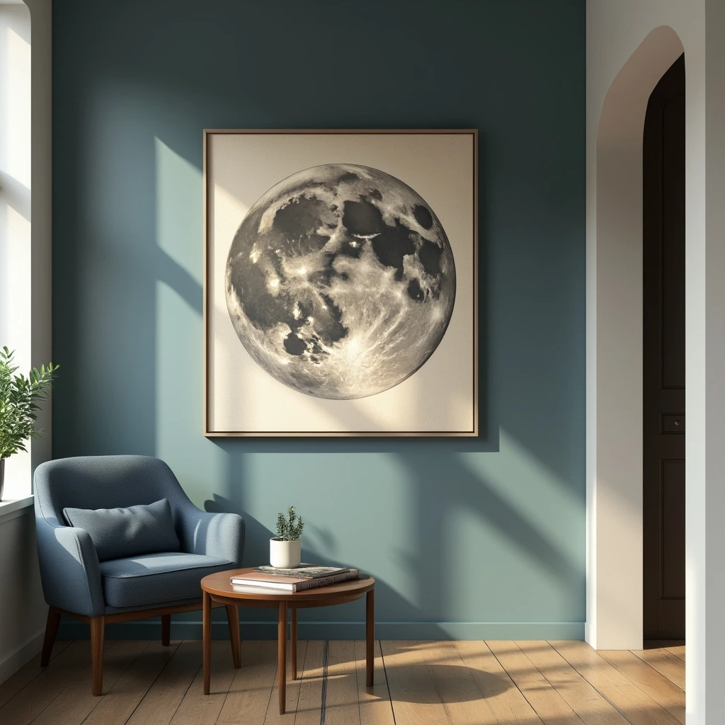 Create a bold and dynamic text design for the word "TARGET THE MOON" logo wall. a sophisticated mature woman modern new yorker creative entrepreneur everyday life style pose full body, She is dressed in a white blouse the image is for her body, the minimalist lobby offices background is in pastel cremewed shade colors and wall darck slate blue, soft and muted light Sunlight filters through the canvases creating a dappled light effect that plays on her face