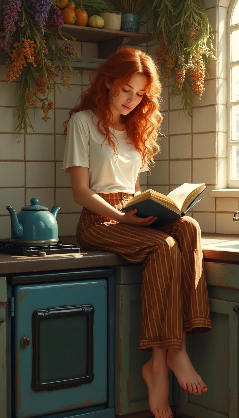 This image is a digital artwork depicting a young woman sitting on a kitchen counter, immersed in reading a book. She has long, wavy, curly reddish blonde hair that cascades down her shoulders. She is wearing a white short-sleeve t-shirt and high-waisted, wide-legged brown and tan striped pants. Her feet are bare. The kitchen background is rustic, with a tiled counter and a vintage stove with a blue oven door. A blue kettle is visible on the stovetop. Above the counter, there is a collection of colorful herbs and dried flowers. The lighting is warm and natural. The overall style of the image is warm and nostalgic, capturing a moment of quiet contemplation in a rustic kitchen.