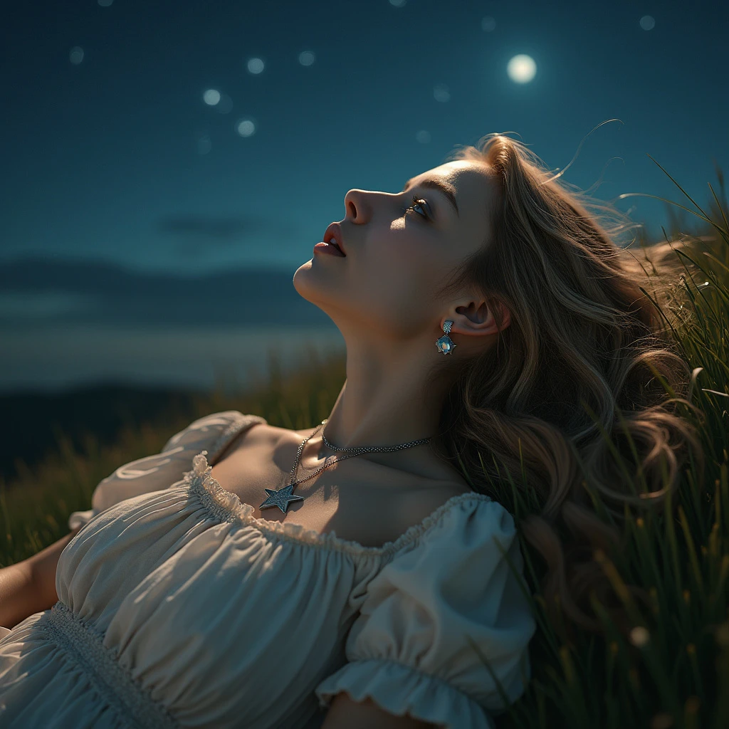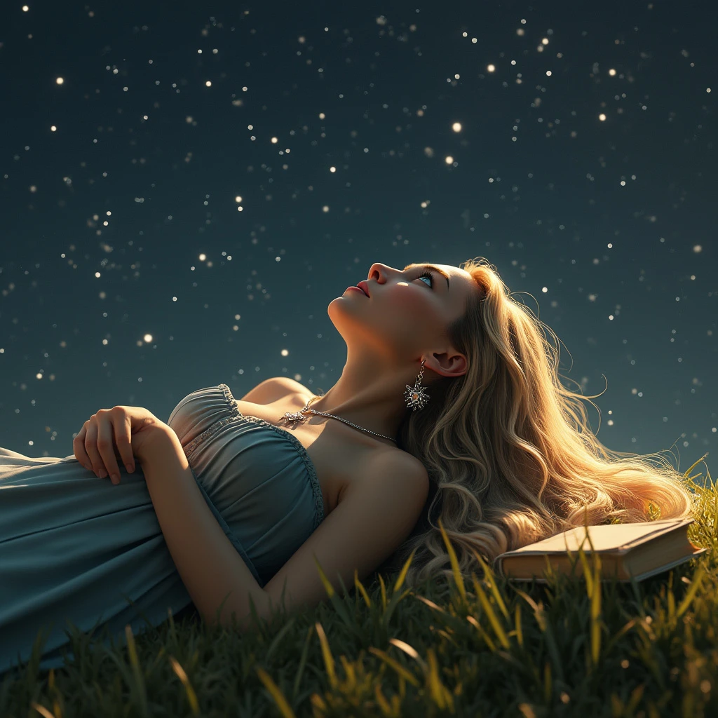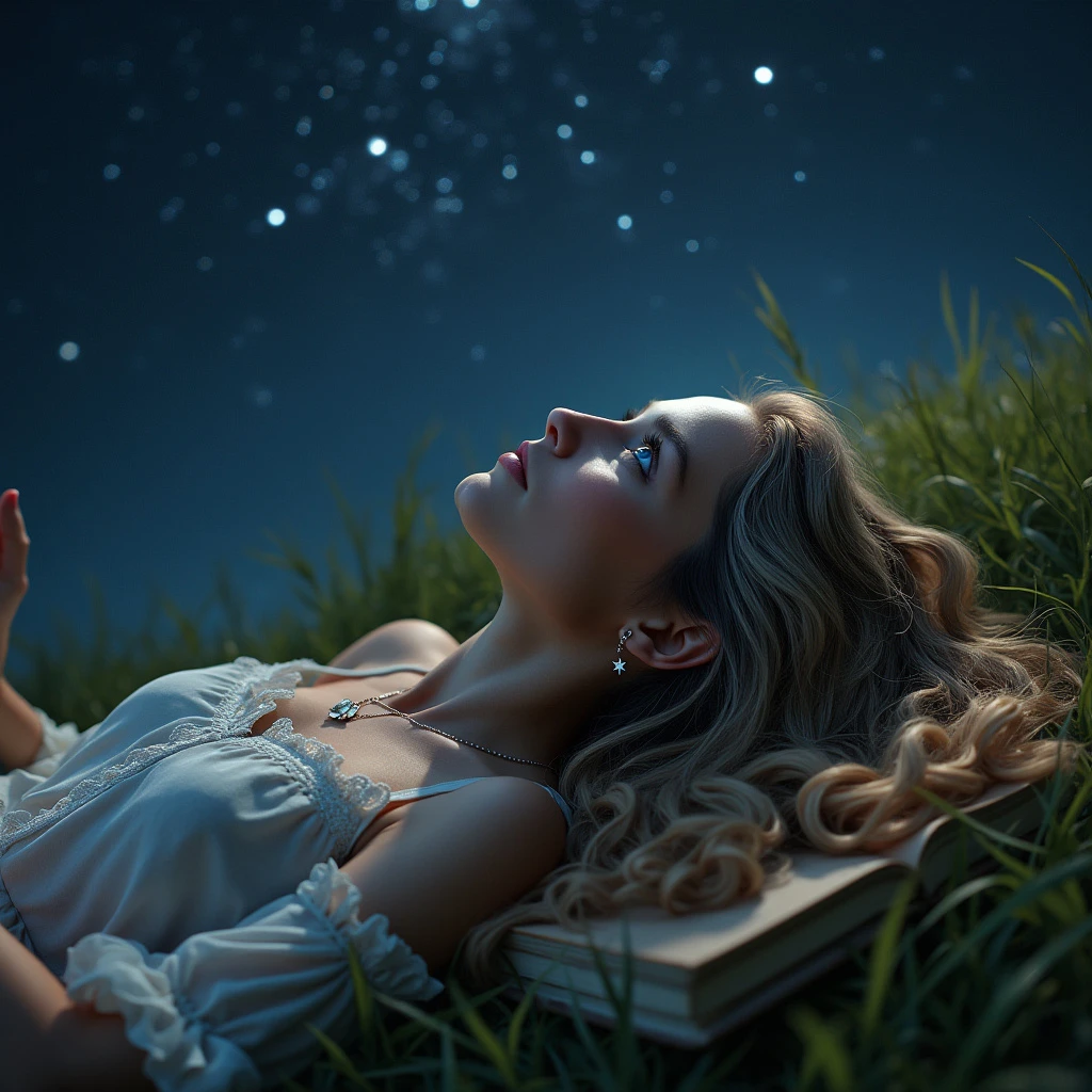 a photograph of a whimsical woman with long wavy dark blond hair and blue eyes staring up at the night sky. maximum ultra high definition image quality and rendering, maximum image detail, maximum realistic render, ultra realist style, realist side lighting, 8K high definition, realist soft dramatic lighting. The woman is laying back on a green grass on a hill side, her hair spread out around her head. The night sky is moonless and very dark and full of stars. She has a silver necklace with a star pendant and silver earrings. The woman is scene from her waist up. Her head is resting on a book. She is reaching up to the stars.