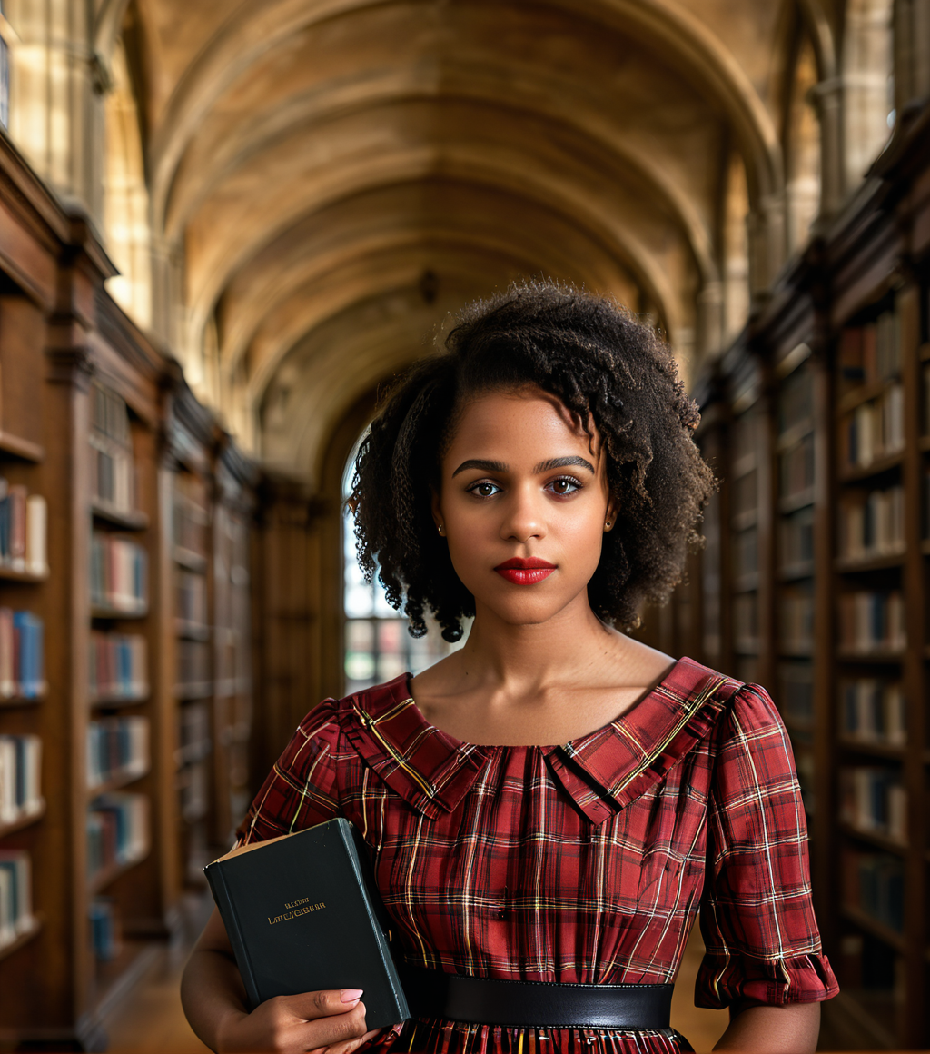 <lora:N4th4113_08XL-000007:0.9>, a (close up shot) photograph of (beautiful 28 year old) (N4th4113:1.1) (an african american woman:1.3) with (dark hair:1.2) and (light brown complexion:0.5) as a librarian,wearing a red plaid dress,standing in a (library at Oxford University:1.3),holding an leather bound book,with long rows of bookshelves in the background,multi-level with (high arched ceiling:1.2),(sexy smirk:0.7),lips,makeup and mascara, cinematic photograph, photorealism, realistic lighting,(bokeh),realistic shadows,masterpiece,Award-winning, 8K wallpaper,Hyperrealistic, intricate detailed, subsurface scattering, rule of thirds, detailed pupils, 35mm photograph, detailed skin texture, subsurface scattering