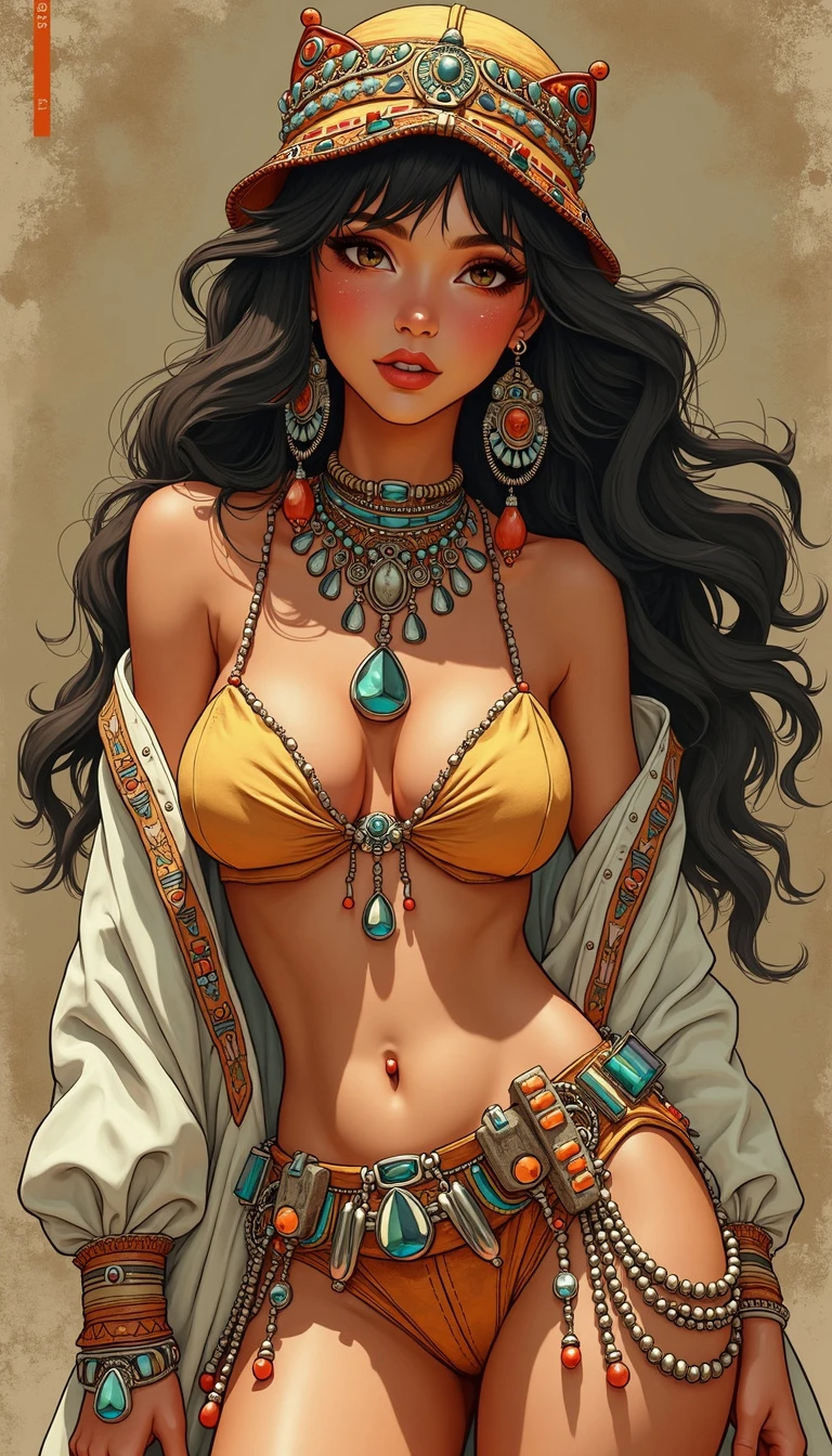 Bohemian anime girl outfit posing with Tuareg clothing , intense close - ups, classy portraiture, ultra detailed illustration, hyper - detailed, bohemian futurism by Syd Mead, Rolf Armstrong, sharp colors, beautifully attractive face, curvaceous body, waist up, flirty expression, ethereal dimension, expressive, in the style of bohemian core, wrapped, celestialpunk, the new fauves, exaggerated anatomy
