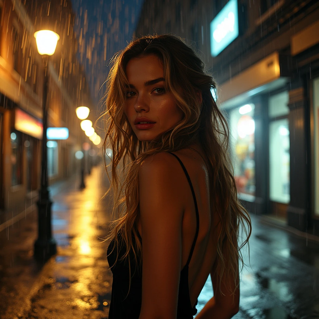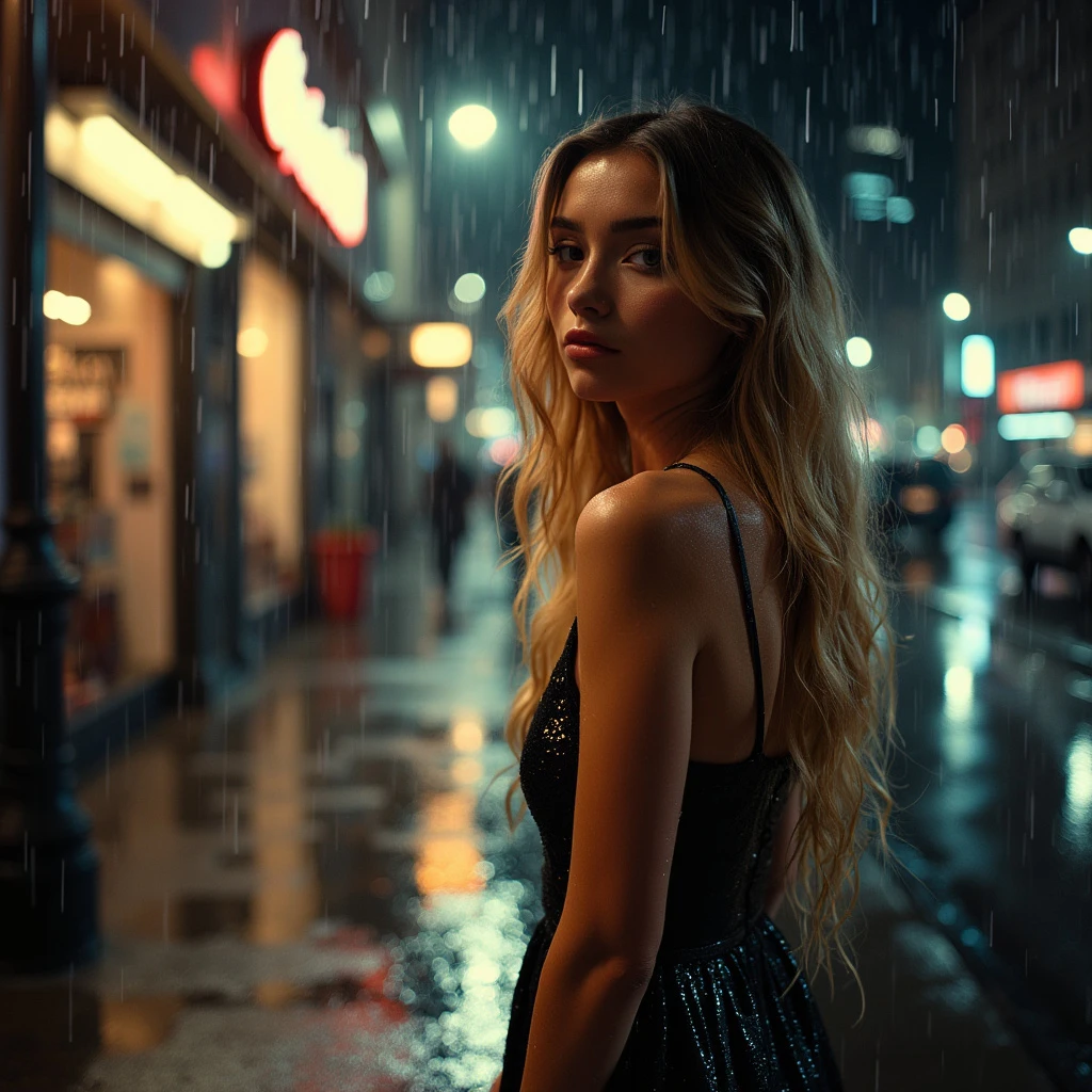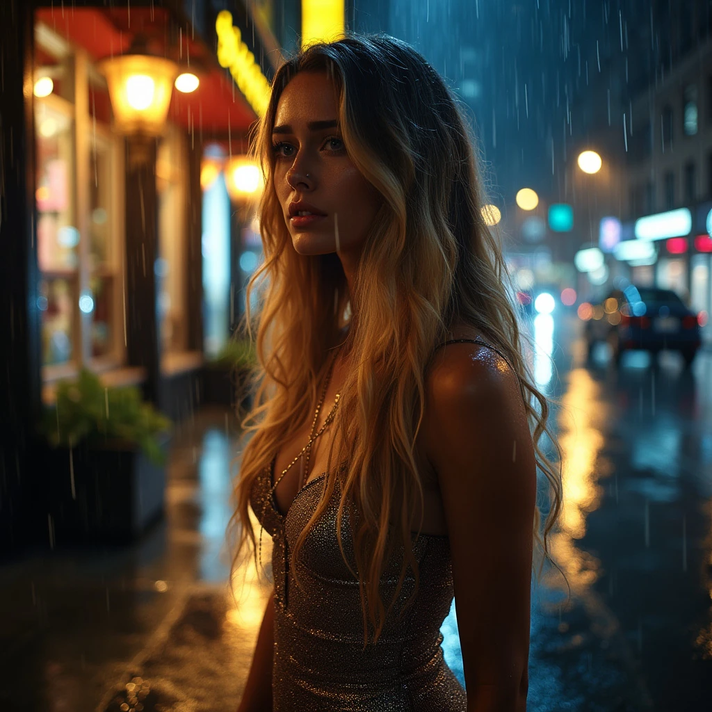 a beautiful woman with long wavy dark blond hair with golden highlights is standing on a dark city street at night in the rain. she stands under a street light outside shops. she is sad. she is soaked by the rain. full-length photograph. the woman is wearing a party dress.
