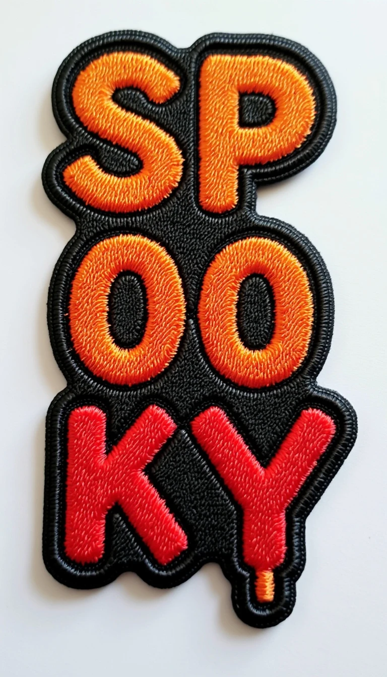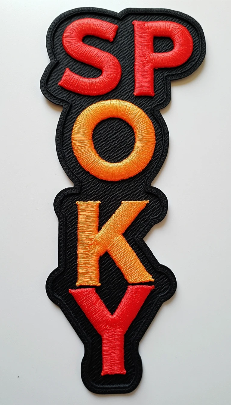 cool iron on patches colorful text " SP OO KY " one by one downwards on patched only red and orange color, sticker, black thick outline, white background