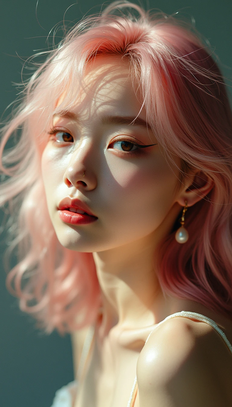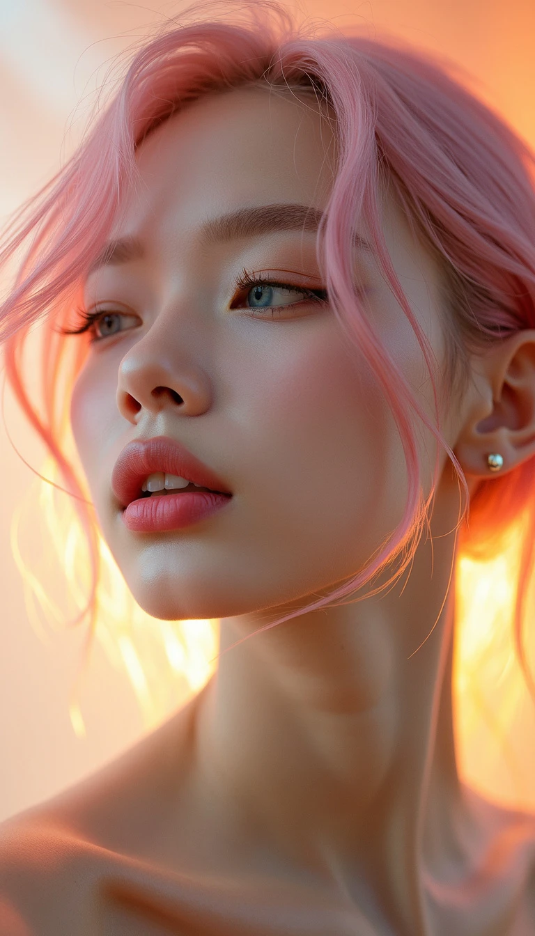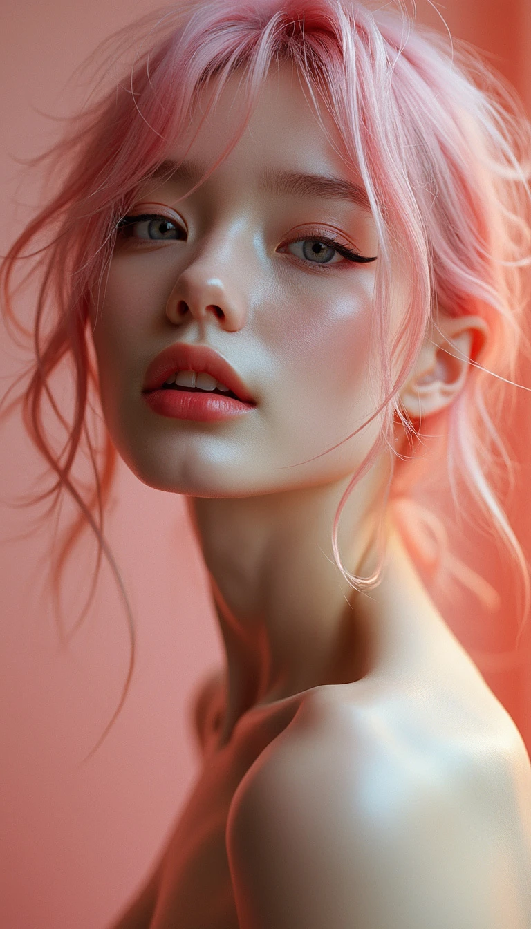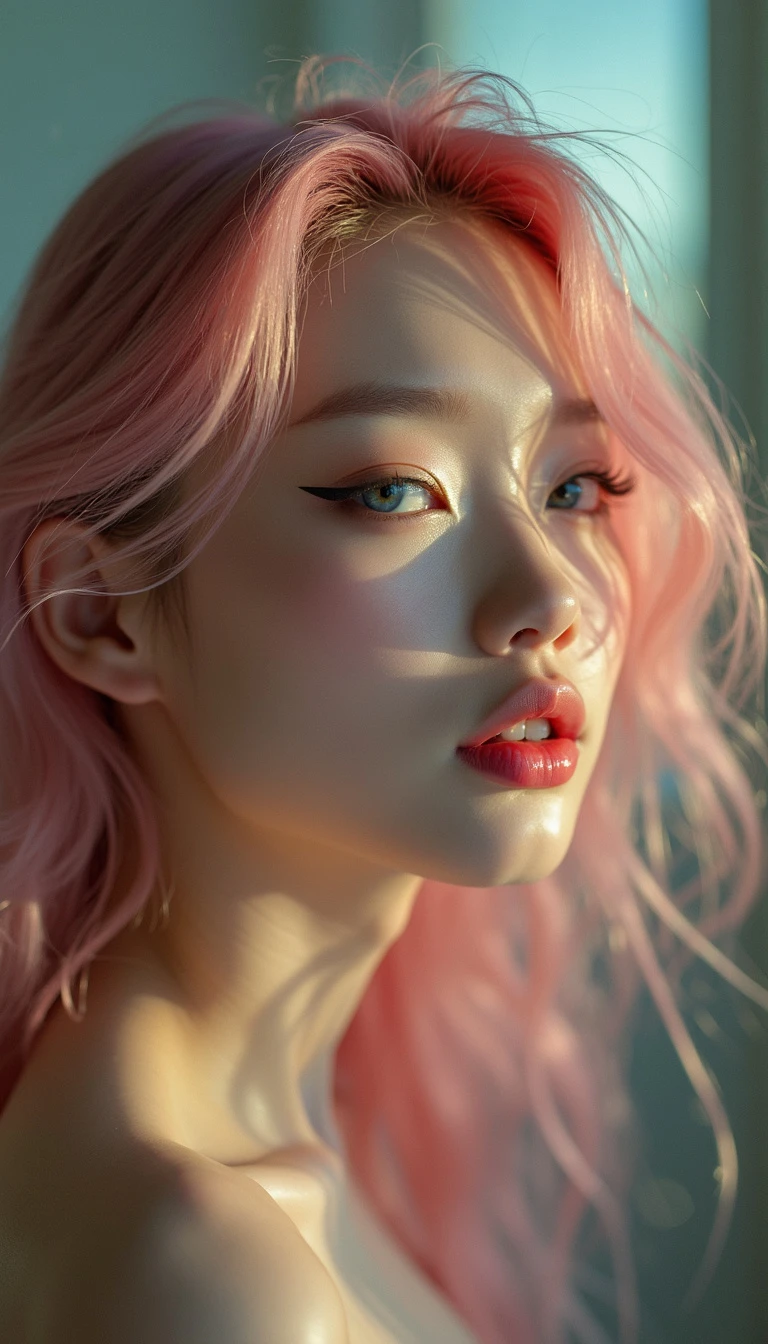 Avant-garde fashion headshot photography of a fully nude 25 years old DANISH kpop disney princess, for VOGUE KOREA magazine. Windswept pink hair over face, winged eyeliner. Close-set round almond-shaped pale-blue eyes, prominent double eyelids, very puffy aegyo-sal, long well-defined eyelashes. Cute nude breasts. Extremely pale white skin complexion, innocent tall facial structure with fatty cheeks and high cheekbones, shiny wet skin. gentle smile with large prominent top row teeth. Vibrant fading studio background. Side sunlight illumination, side view, slightly raised chin. Hazy atmosphere with diffuse highlights and motion blur.